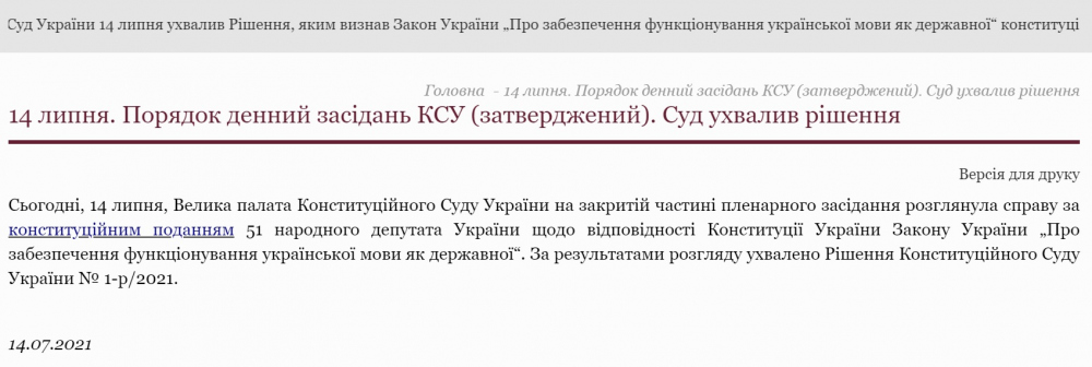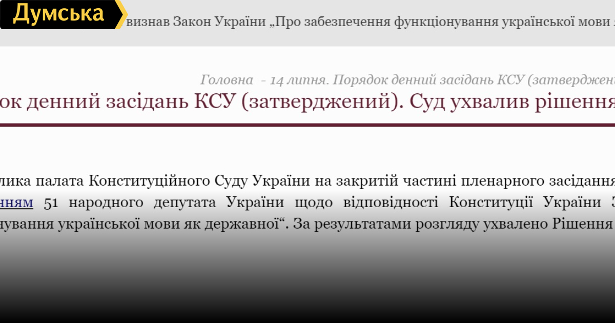 КСУ признал конституционным закон, по которому украинский язык определяется единственным государственнымКонституционный суд Украины признал конституционным закон об обеспечении функционирования украинского языка как государственного. Суд принял такое решение на пленарном заседании Палаты спустя два года, как за законопроект проголосовала Рада прошлого созыва. На сайте КСУ отмечается, что на пленарном заседании Большой палаты суда было принято решение о конституционности закона «Об обеспечении функционирования украинского языка как государственного». Представление в суд подавал 51 народный депутат. СМЕРТЬ РОСІЙСЬКИМ ОКУПАНТАМ! Помітили помилку? Виділяйте слова з помилкою та натискайте control-enter |