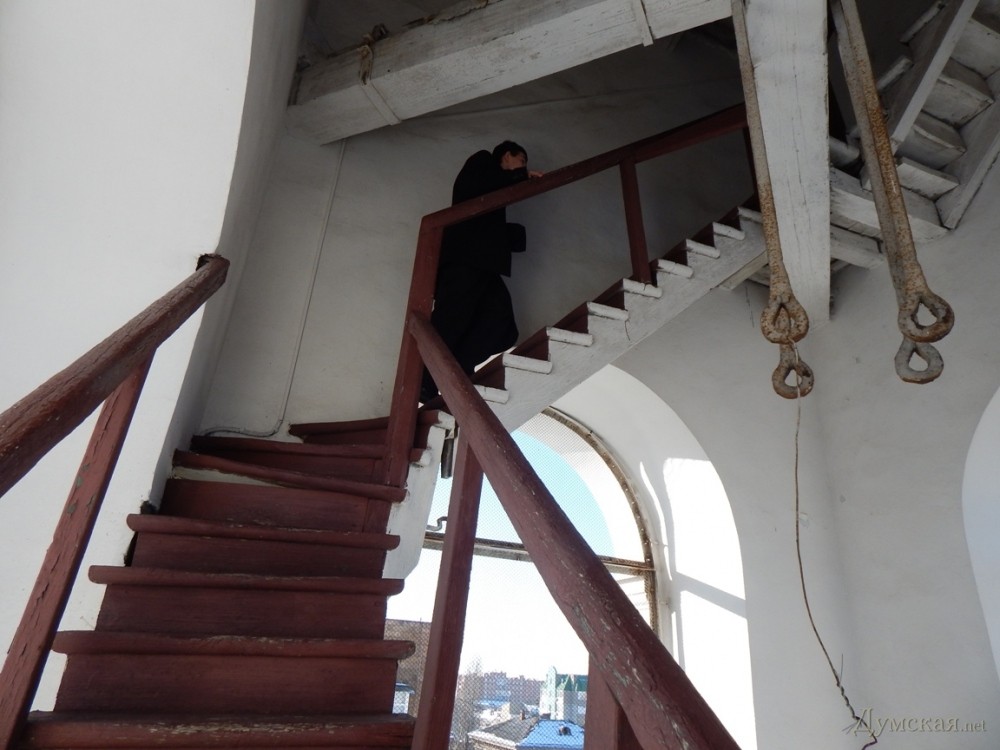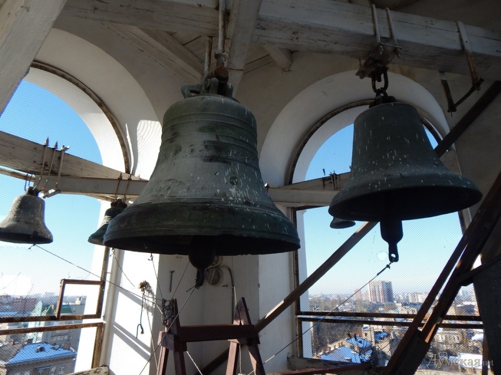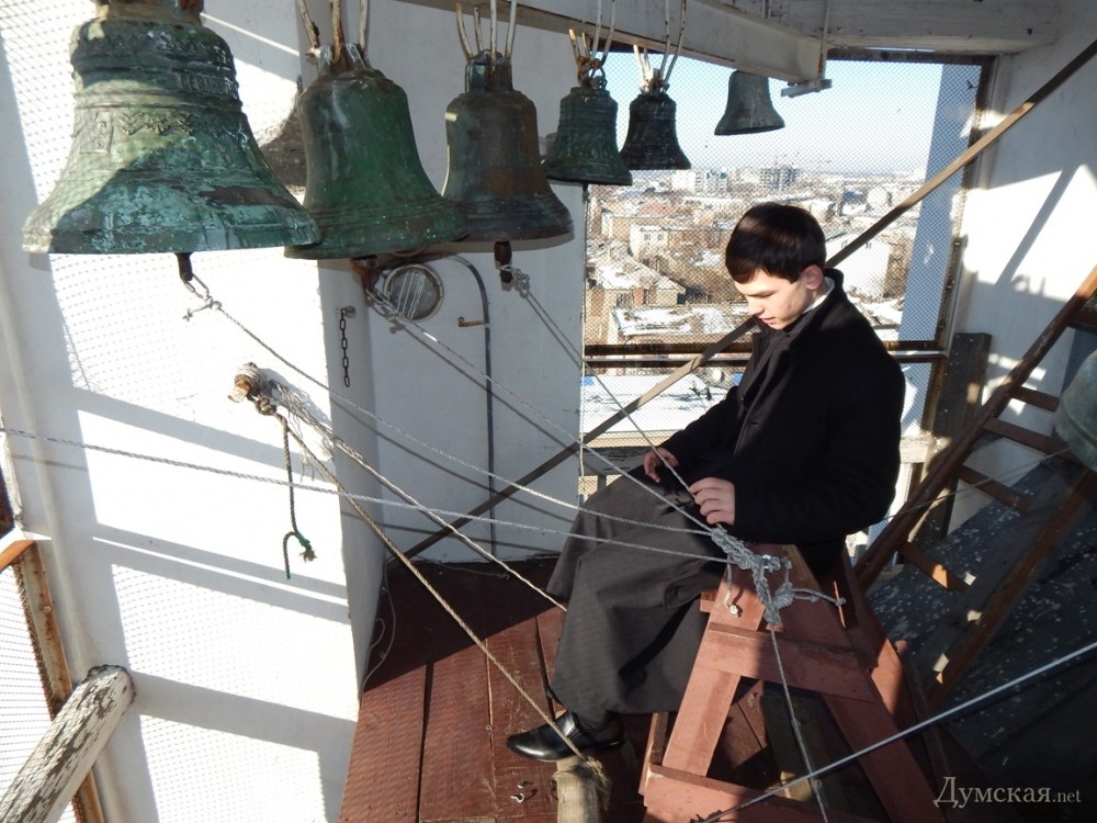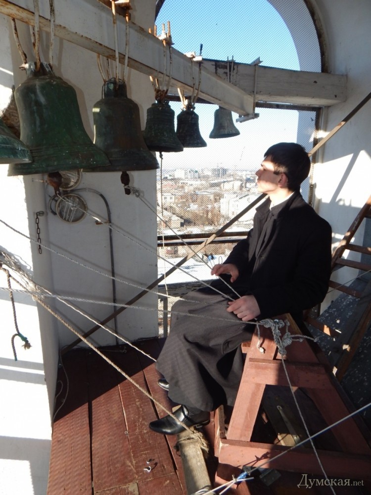 Кто звонит в колокол: на второй по высоте колокольне Одессы работает юный семинаристКто звонит в одесские колокола? На смену церковнослужителям с мощными руками и музыкальным слухом едва ли не повсеместно приходит автоматика. Впрочем, в некоторых храмах по-прежнему пользуются услугами специально обученных людей, считая, что хороший звонарь лучше любой умной машины. Чтобы узнать все секреты древнего мастерства, «Думская» побывала на одной из самых высоких колоколен города — Свято-Успенского кафедрального собора, что на Преображенской улице. Мы отправились туда в день Рождества Христова — когда все храмы бьют в колокола. Малиновый перезвон разливается по всему городу, кого-то наполняя светом и радостью, а кому-то просто радуя слух. Сам же дирижер колокольного хора всегда остается, так сказать, за кадром – он не собирает оваций и цветов, не получает наград и премий, даже имени его прихожане обычно не знают. Этим звонари похожи на иконописцев — в памяти людской остаются только самые-самые. Колокольня Свято-Успенского собора возвышается на 56 метров (больше — 72 метра — только у Спасо-Преображенского, но там колоколами управляет компьютер). Перспектива подняться на самый верх сперва нас обрадовала, но с каждой ступенькой все отчетливее ощущался страх высоты. Каменная лестница, переходящая в деревянную, местами скрипит и пошатывается. Преодолеваем небольшой винтовой подъем, и с открытого балкона перед нами открывается прекрасный вид на город. Еще один деревянный пролет, и мы оказываемся в колокольной «рубке». Здесь — владения 18-летнего учащегося духовной семинарии Владислава Бабенко. Вот он, словно за банкетку у рояля, усаживается на деревянный табурет. Вместо клавиш – хвосты веревок, соединенные с языками колоколов, вместо педалей — самодельная конструкция из досок. Звонарь попеременно нажимает на них ногами, а руками вращает в разные стороны сразу несколько веревок. Сначала колокольный «хор» будто распевается мягким звоном, который плавно переходит в благозвучную мелодию – звонарь сообщает об окончании утренней службы. В этом, говорит он, и заключается главное назначение колоколов – сообщать горожанам о том или ином событии. «Звуки эти наполняют людей радостью и светом, известны даже случаи чудесных исцелений колокольным звоном. Кроме того, наши предки считали, что даже небольшие колокольчики отпугивали нечистую силу. Их вешали на ноги прокаженным и преступникам», — рассказывает Владислав. Юный семинарист увлекается звонарством всего два года, но уже научился виртуозно управлять огромными колоколами и даже успел сочинить несколько собственных композиций. Для справки: у каждого храма имеется свой фирменный мотив. В подчинении у Владислава – десять колоколов, отлитых еще в послевоенный период из медно-оловянного сплава. Звучание, говорит наш собеседник, зависит как от качества металла, так и от толщины стенок и диаметра колокола. Маленькие колокола издают высокие звуки, а большие, соответственно – низкие. Меняется звучание и от неправильного обращения с колоколами. Бить в них следует с определенной силой, очень важно не переусердствовать. Иначе бронза может попросту лопнуть. Покупка нового колокола обычно затягивается на года. «Хочется, конечно, чтобы колоколов было больше, а диапазон голосов — шире. Вообще, есл
