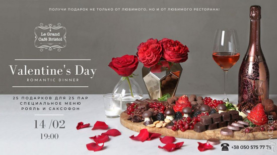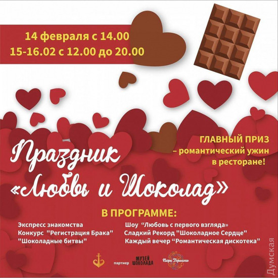 Парк Горького просыпается от зимней спячки и приглашает одесситов на праздник Любви и Шоколада. С 14 по 16 февраля здесь можно будет полакомиться вкуснятиной и весело провести время. Организаторы запланировали насыщенную программу для гостей праздника. Так, в списке мероприятий — шоу-конкурс «Любовь с первого взгляда», конкурс для взрослых «Регистрация Брака», сладкий рекорд «Шоколадное Сердце», интерактивные «Шоколадные битвы», конкурс рисунков и мастер-класс «Валентинка». Кроме того, желающие смогут принять участие в экспресс-знакомствах. Каждый вечер в эпицентре праздника будет проходить «Романтическая дискотека». Еще одна дискотека, но на этот раз сугубо для подростков, пройдет в арт-центре им. Веры Холодной. 14 февраля здесь соберутся самые модные тинейджеры Одессы. Веселить подрастающее поколение будут заводные ведущие и диджеи. В программе диско-пати – танцевальный батл, безалкогольный бар, конкурсы и подарки. Стоимость билетов — 300 грн. Тематический спектакль ко Дню всех влюбленных покажут в одесском ТЮЗе 14 февраля. Зритель увидит психологическую драму под названием «Ночь святого Валентина». За реализацию сложной постановки взялся заслуженный деятель искусств Украины, популярный одесский драматург Александр Мардань. Это лихо закрученная интрига о том, как мужчина пришел к женщине, и как оба были озабочены совсем не тем, чем бывают озабочены люди в подобных случаях. Стоимость билетов — 80-120 грн. БУМБОКС Легендарная группа «Бумбокс» даст концерт на сцене Филармонии. Музыканты презентуют свой новый альбом «Таємний код» 14 февраля. Концерт пройдет в рамках всеукраинского турне, которое обещает стать самым масштабным в истории коллектива. Новый альбом музыканты создавали в Украине, Франции и США и впервые за 15 лет существования включили туда больше 11 песен. Три из них уже успели покорить сердца украинцев и стали суперхитами – «Безодня», «Твій на 100%» и «Тримай мене». Стоимость билетов — 300-2300 грн.