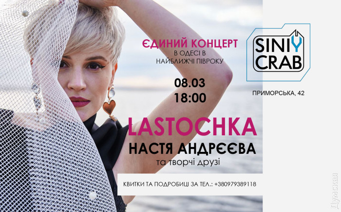 Останній концерт Lastochka Настя Андрєєва в найближчі пів року відбудеться 8 березня в артпросторі «Синій Краб» (Приморська, 42).