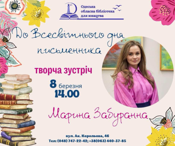 Творча зустріч із талановитою письменницею Мариною Забуранною, яка розповість про світ української літератури, відбудеться 8 березня в Одеській обласній бібліотеці для юнацтва (Академіка Корольова, 46).
