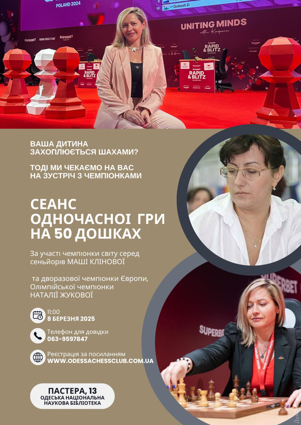 Діти гратимуть з двома відомими чемпіонками, міжнародними гросмейстерами Машею Кліновою та Наталією Жуковою.