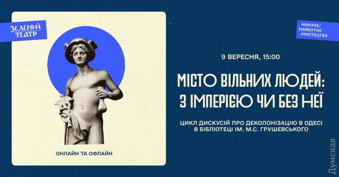 Куди піти в Одесі: патріотичний стендап, лекція про деколонізацію та орган в ОперномуПершого осіннього вікенду культурне життя в Одесі буде досить насиченим. Про найцікавіші події розповість рубрика «Думської» — «Куди піти в Одесі», яка тепер знову виходитиме щочетверга. Нагадуємо, що приміщення, в яких проходять концерти, виставки та лекції, обладнані укриттями на випадок повітряної тривоги. ДИСКУСІЯ ПРО ДЕКОЛОНІЗАЦІЮ Чергова дискусія із циклу «Місто вільних людей: з імперією чи без неї» відбудеться 9 вересня у бібліотеці імені Грушевського. Учасники зустрічі поговорять про ту частину минулого, яка пов'язана з російською імперією, і про те, чи завдячує їй Одеса своїм процвітанням. Спікерами дискусії стануть історик Олександр Бабич, історик та літературознавець Гера Грудєв, підприємець та радник міського голови Одеси з гуманітарних питань Микола Вікнянський. Виручені кошти підуть на підтримку українських захисників та захисниць. Старт о 15:00. Вартість участі – free donation. «SMILE, UKRAINIAN! Дубль 5» У Будинку клоунів 9 вересня відбудеться показ українських короткометражних комедій «Smile, Russian! Дубль 5». Глядачі побачать кінострічки «Довіряйте професіоналам», «Останній лицар», «Шпілі-Вілі», «Made in Чайна», «Сходознавець», «Приємного» та «Магазинчик». Показ під девізом «Позитивний настрій – запорука перемоги» відбувається на підтримку ЗСУ та «Фонду України». Старт о 19:00. Вартість квитків – 90-150 грн. «РАЗОМ ДО ПЕРЕМОГИ» У фойє Одеського театру юного глядача 10 вересня відкриється виставка мистецького та декоративно-ужиткового мистецтва «Разом до перемоги». До експозиції увійдуть роботи як юних майстрів, так і досвідчених художників, присвячені сучасним подіям. Гості виставки зможуть познайомитись не лише з роботами авторів, а й побачити виставу «Клубок казок». Старт о 12:00. ТОЛОКА В УКРИТТІ Велике прибирання у сховищі в парку Шевченка влаштують 10 вересня. Організатори запрошують усіх, хто бажає зробити свій внесок у безпеку міста та одеситів, які незабаром зможуть користуватись сховищем. Як бонус всі учасники отримають можливість прогулятися Зеленим театром, який відкриє свої двері вперше цього року. Старт о 12:00 біля головних воріт театру. МОЦАРТ У ФІЛАРМОНІЇ Музичні шедеври Моцарта звучатимуть 10 вересня в Одеській філармонії. Твори австрійського класика виконає філармонійний оркестр під керуванням заслуженого артиста України Ігоря Шаврука. Ведуча концерту – лектор-музикознавець Ельвіра Паламарчук. Старт о 17:00. Вартість квитків уточнюйте. «ORGAN & VOICES» Одеський театр опери та балету 10 вересня запрошує гостей послухати, як звучить на сцені театру король інструментів – орган. Концерт «ORGAN & VOICES» відбудеться за участю солістів опери та оркестру. У програмі – твори зарубіжних та українських композиторів, зокрема Баха, Бізе, Сен-Санса, Лисенка та інших. «Зворушливі, ніжні звуки органу, що дарують надію і віру, торкнуться найтонших струн вашої душі», — кажуть організатори. Старт о 18:00. Вартість квитків – 100-400 грн. «ПОЗАШЛЮБНА ДОЧКА ГАМЛЕТА» В Одеському обласному драматичному театрі 10 вересня покажуть неординарну комедію «Позашлюбна дочка Гамлета», героями та творцями якої можуть стати усі глядачі. Цей спектакль про те, як винахідливий драматург намагається створити щось нове на основі творів великого Шекспіра. «Але директор театру має св