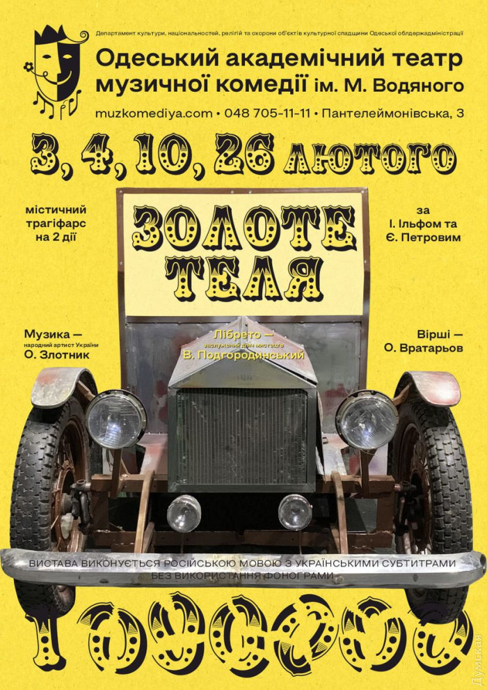 Куди піти в Одесі: прем`єра «Золотого теляти» в Музкомедії, «Смак сонця» в ТЮГу і музика The BeatlesВже через місяць настане весна, а поки третину зими, що залишилася, можна скрасити, керуючись порадами від «Думської» і рубрики «Куди піти в Одесі». Так, цього тижня в Одесі заплановані прем'єри вистав, виставка і шоу з піснями The Beatles. «ЗОЛОТЕ ТЕЛЯ» Прем'єра вистави «Золоте Теля» за однойменним твором Ільфа і Петрова відбудеться 3 і 4 лютого в театрі Музкомедії. Постановка в жанрі містичний трагіфарс присвячена продовженню роману «Дванадцять стільців». Тут повсталий з попелу аферист Остап Бендер продовжує шукати способи легкої наживи, щоб нарешті поїхати в Ріо-де-Жанейро. Творці вистави розповідають, що театр уперше звертається до цього твору, але обіцяють, що на глядачів чекає яскрава акторська гра, дотепні ходи, режисерські знахідки, чудова музика і захопливий сюжет. Старт о 18:00. Вартість квитків — 100-400 грн. «ЕМІГРАНТИ» Гостросоціальну виставу «Емігранти» покажуть 3 лютого в Українському театрі. Це одна з найвідоміших п'єс польської драматургії та світового театру загалом. Тут порушено теми, про які зазвичай не прийнято говорити вголос. За сюжетом, двоє емігрантів, дуже різних за складом характеру, опиняються в однаковій ситуації — без своїх родин, без можливості гратися з власними дітьми і радіти їхнім успіхам. Вони — у чужій країні. «Через обставини чоловіки винаймають у підвалі дешеве житло і змушені зустрічати разом Новий рік. Тож нарешті у них з'являється можливість відверто поспілкуватися», — йдеться в анонсі. Старт о 18:00. Вартість квитків — 100 грн. КОНЦЕРТ ВІРТУОЗНОЇ МУЗИКИ Концерт, присвячений Збройним силам України та біженцям, відбудеться 4 лютого в Одеській філармонії. У програмі — твори Паганіні, Венявського, Вівальді, Скорика та інших іменитих композиторів. Їх виконають соліст Одеської обласної філармонії імені Давида Ойстраха Георгій Соколов (скрипка) і лауреатка міжнародного конкурсу Анастасія Мельник (фортепіано). Старт о 14:00. Вартість квитків уточнюйте. ЛЕКЦІЯ ПРО ЧЮРЛЬОНІСА Лекцію, присвячену унікальній особистості — композитору, художнику, фотографу і поету Мікалоюсу Константінасу Чюрльонісу, — прочитають 4 лютого в Музеї західного і східного мистецтва. Лектор Олександр Вазілов розповість слухачам, чому слух Чюрльоніса називають «кольоровим», про те, як він умів «бачити» музику і «чути» живопис, і наскільки його творчість насичена символікою. Старт о 14:00. Вартість квитків — 100 грн. МУЗИКА The Beatles Черговий концерт на потреби ППО Одеси — Beatles Blues пройде в джаз-клубі Perron №7 4 лютого. «Драйвові гітарні рифи і соло на саксофоні розгойдають вас і змусять на кілька годин відволіктися від похмурих буднів і згадати безтурботну юність, коли «Бітлз» були музикою щастя і свободи (хоча, чому «були«?)» — зазначають організатори концерту. 50% зібраних коштів буде спрямовано на технічне забезпечення протиповітряної оборони міста. Старт о 18:00. Вартість квитків — free donation. ПРОГУЛЯНКА ПРЕОБРАЖЕНСЬКОЮ Екскурсія наймальовничішими і найзнаковішими місцями вулиці Преображенської в рамках проекту «АрхОдеса» відбудеться 5 лютого. Майбутня зустріч присвячена не лише самій вулиці та її перетворенням, а й відомим і не дуже людям, які її населяли. Зокрема, учасники прогулянки дізнаються маловідомі факти з біографії харків'янки Люсі Гурчен