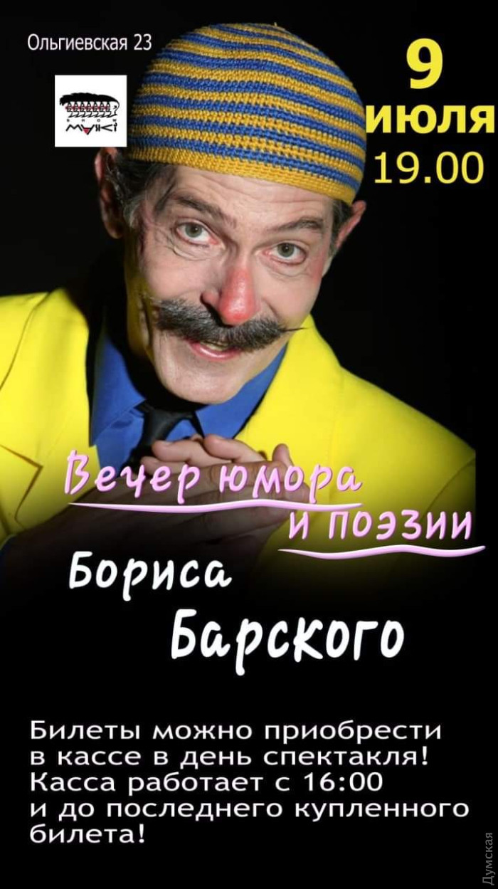 Талантливый комик Борис Барский 9 июля проведет в «Доме клоунов» вечер юмора и подарит зрителям 90 минут прекрасного настроения.