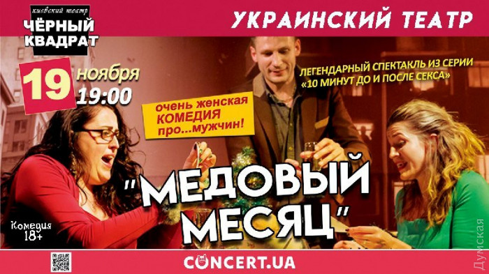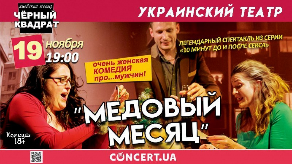 Театр «Черный квадрат» 19 ноября представит свою фирменную комедию «Медовый месяц» в Украинском театре.