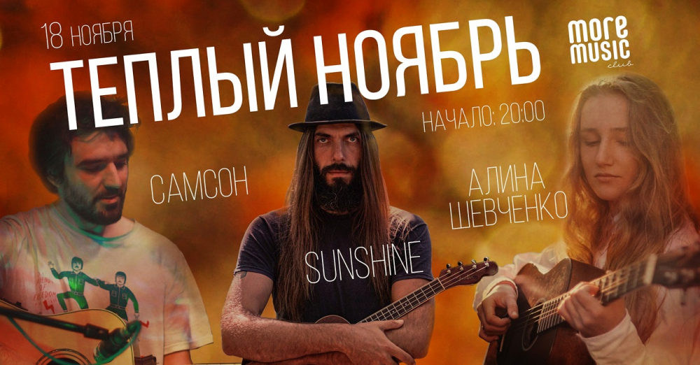 На сцену клуба выйдет лидер легендарной одесской инди-рок группы «Продается Солнце!» Александр Самсон. В последнее время он нечасто балует публику своими выступлениями, так что организаторы советуют не упустить эту возможность. На сцене More Music Club вечером в четверг, 18 ноября, также выступят Алина Шевченко и Sunshine.