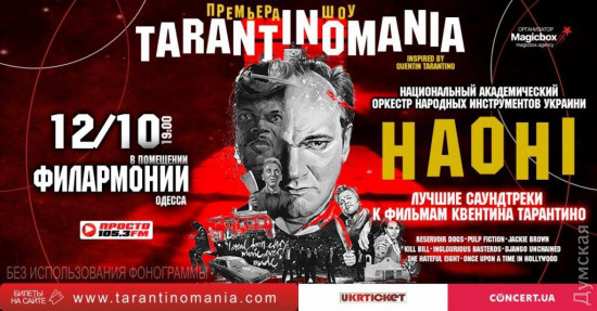 Так, 12 октября зрители услышат саундтреки к фильмам «Бешеные псы», «Криминальное чтиво», «Джанго освобожденный», «Убить Билла» и, конечно же, свежей и такой долгожданной киноленте «Однажды в Голливуде» режиссера Квентина Тарантино. Музыка прозвучит в исполнении Национального академического оркестра народных инструментов (НАОНІ).