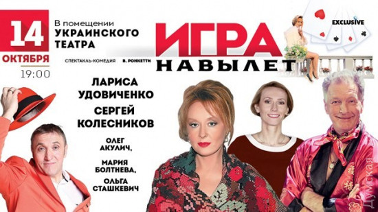 На сцену украинского театра выйдут всенародно любимые актеры, чтобы сыграть в небольшой итальянской пьесе под названием «Игра на вылет». Насладиться талантливой игрой актеров и от души посмеяться можно будет 14 октября.