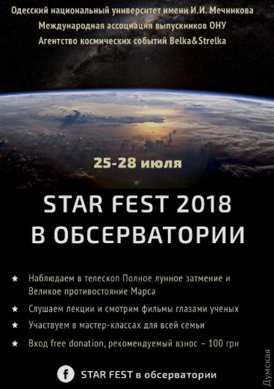Куда пойти в Одессе: юбилей Маразли, звездный фестиваль, Олег Винник и Тото КутуньоЕсли события в стране и мире вас не радуют, настроение на нуле, а мысли только о глобальных катаклизмах, для вас есть один дельный совет — выключить телевизор и вай-фай и сходить куда-то развеяться. Выбрать подходящее место и мероприятие вам поможет еженедельная рубрика «Думской» — «Куда пойти в Одессе» . ЗВЕЗДНЫЙ ФЕСТИВАЛЬ В ОБСЕРВАТОРИИ 24-28 июля в астрономической обсерватории Одесского национального университета им. Мечникова проходит «Star fest». Первые три дня участники звездного фестиваля посвящают встречам, экскурсиям, лекциям. Самое интересное ожидается с вечера 27 июля до часу ночи 28-го. Именно в это время можно будет наблюдать астрономическое событие года – полное теневое лунное затмение и событие всего десятилетия – великое противостояние Марса. В 21:30 начнется наблюдение полного теневого лунного затмения и парада планет с комментариями астрономов. В различные телескопы обсерватории можно будет увидеть все фазы события. Вход — free donation. Рекомендованный взнос — 100 грн. ОБЕ ДВЕ В пятницу, 27 июля, в Public Beach Club выступит московская поп-группа «Обе две». На концерте в Одессе группа во главе с харизматичной вокалисткой Катей Павловой презентуют новый альбом «Радости страсти». Стоимость билетов — 400 грн. ПЕРСОНАЖ Если хочется нетривиального кино, дающего пищу для ума, идите на встречу киноклуба в Mindspot. 27 июля здесь покажут фильм «Персонаж». По словам организаторов встречи, этот фильм — одна из лучших возможностей посмотреть на себя со стороны. В «Персонаже» речь пойдет о том, что происходит с нами, когда мы проживаем не свою жизнь. Перед показом для зрителей проведут совместную «настройку» для большей восприимчивости. Стоимость посмотра — 100 грн. ВИВАТ БАЛЕТ С 27 по 29 июля в Оперном театре будет проходить гала-концерт «Виват балет». На главной театральной сцене Одессы встретятся ведущие хореографы и исполнители мирового уровня. Стоимость билетов — 100-600 грн. ОЛЕГ ВИННИК 28 июля на стадионе «Черноморец» в парке Шевченко выступит любимец украинских женщин Олег Винник. Концерт под названием «Ты в курсе» пройдет в рамках всеукраинского тура, стартовавшего весной нынешнего года. В программе прозвучат как новые песни, так и самые известные хиты Олега Винника. Стоимость билетов 350-1000 грн. ФЕСТИВАЛЬ ТРАНС-МУЗЫКИ Одесские диджеи решили вспомнить былую популярность транс-музыки и организовали дневной фестиваль электронной музыки «Summer Dream Odesa open air». Мероприятие пройдет 28 июля на территории летнего театра в Горсаду. Организаторы уверены, что мероприятие станет началом возрождения интереса к этому жанру. Известно, что в лайн-ап фестиваля войдут треки от Redcheek, Reach, Dansky, Imbavei. МАРАЗЛИ И ЕГО ОДЕССА Ко дню рождения общественного деятеля и мецената Григория Маразли, которому так обязана Одесса, 28 июля в Художественном музее пройдет лекция о нем. Об известных и малоизвестных фактах биографии одесского градоначальника расскажет историк Андрей Красножон. «В ходе лекции постараемся вскрыть разные грани личности Григория Григорьевича Маразли, как бы взглянуть через его противоречивую, порой, натуру на созданный им же городской ландшафт, которым пользуемся до сих пор», — анонсируют организаторы. Стоимость участия — 70 грн. Требуется предварительная регистрация. ЛА