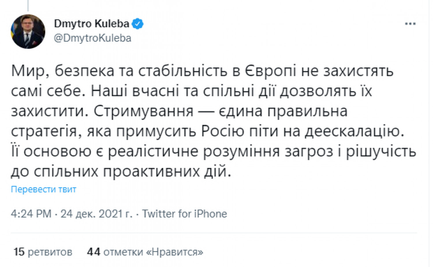 Министр иностранных дел Украины Дмитрий Кулеба заявил, что заставить Россию пойти на деэскалацию может только совместное сдерживание со стороны Украины и ее международных партнеров. Как написал в своем Twitter чиновник, мир, безопасность и стабильность в Европе «не защитят себя сами» и что для этого нужны своевременные и совместные действия. «Сдерживание — единственная правильная стратегия, которая заставит Россию пойти на деэскалацию. Ее основой является реалистическое понимание угроз и решимость на совместные проактивные действия», — подчеркнул Кулеба. СМЕРТЬ РОССИЙСКИМ ОККУПАНТАМ! Заметили ошибку? Выделяйте слова с ошибкой и нажимайте control-enter |