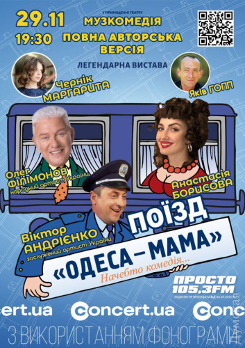 Культова вистава «Поїзд «Одеса-мама» знову на сцені — в пам'ять про Руслану Писанку (на правах реклами)Культову виставу «Поїзд «Одеса-мама» за участю легендарних акторів Олега Філімонова та Віктора Андрієнка покажуть на сцені Музкомедії 29 листопада о 19:30. Поїзд, купе, чоловік і жінка. Він - мамин синочок, вічний холостяк, який навіть і кроку не ступить без матусі. Вона — темпераментна красуня і щира українка. Усе начебто зрозуміло, але розвиток і фінал цієї відвертої історії змусять вас не тільки сміятися до сліз, а й плакати. Додайте сюди талановиту гру улюблених акторів, драматургію визнаних майстрів гумору і приголомшливий коктейль емоцій і вражень готовий! Вас чекатиме неймовірний сюрприз. Це буде незабутній вечір! Виставу зіграють в пам’ять видатної української акторки театру та кіно й телеведучої Руслани Писанки, яка грала головну жіночу роль. Квитки можна придбати тут СМЕРТЬ РОСІЙСЬКИМ ОКУПАНТАМ! Помітили помилку? Виділяйте слова з помилкою та натискайте control-enter |
