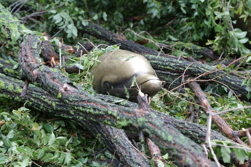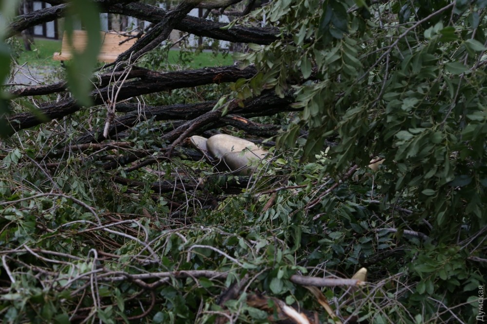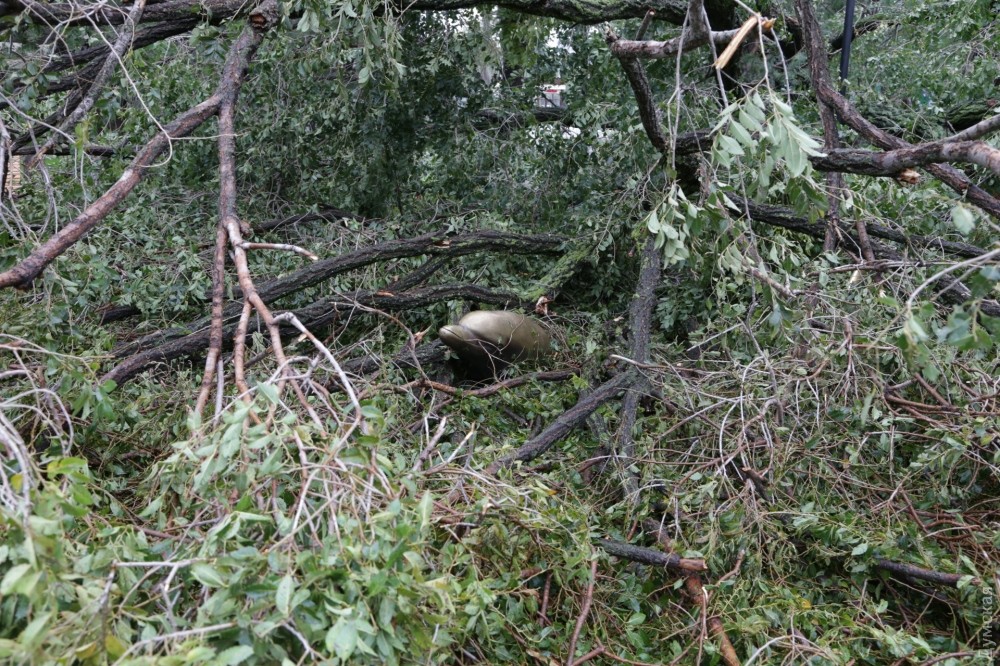 Ветками засыпало новенький фонтан, и сейчас знаменитые дельфины, которые раньше выпрыгивали из земли, выглядывают из листвы.
