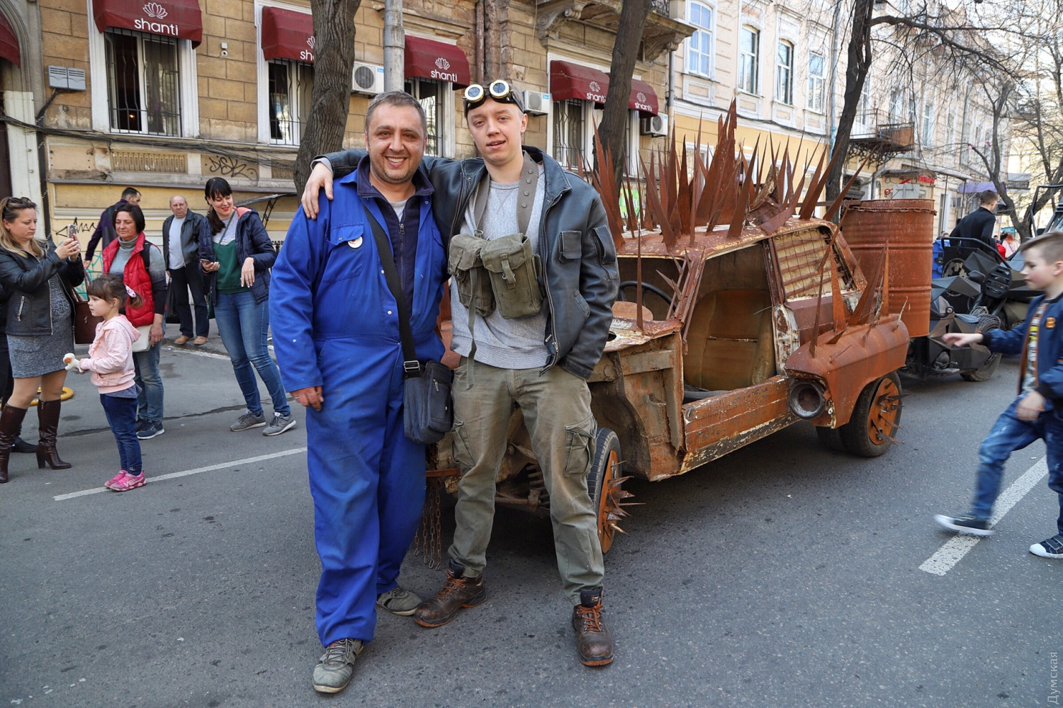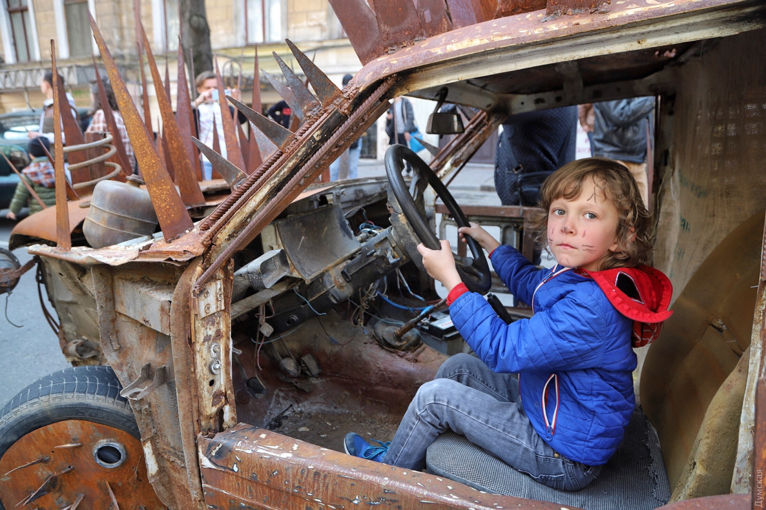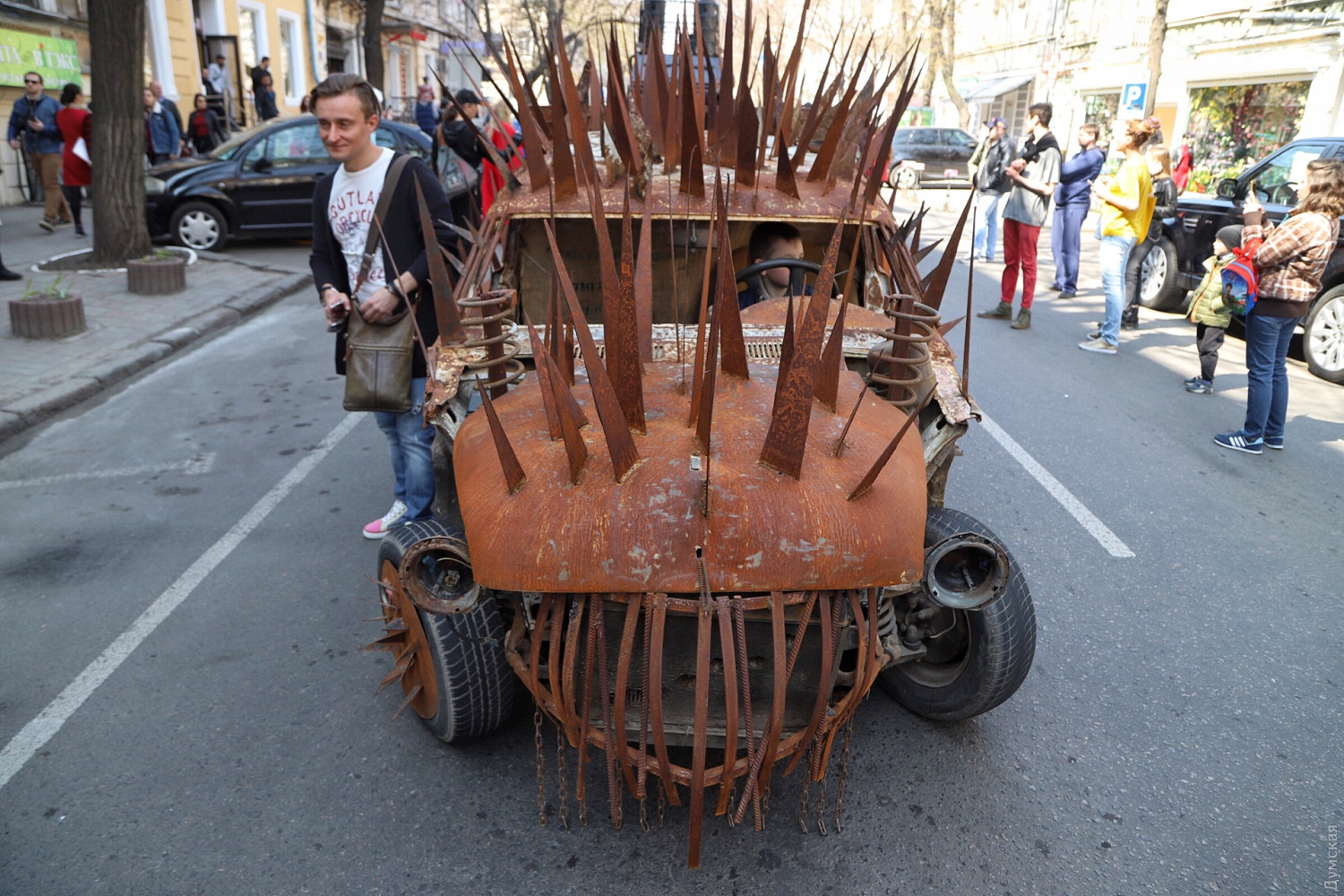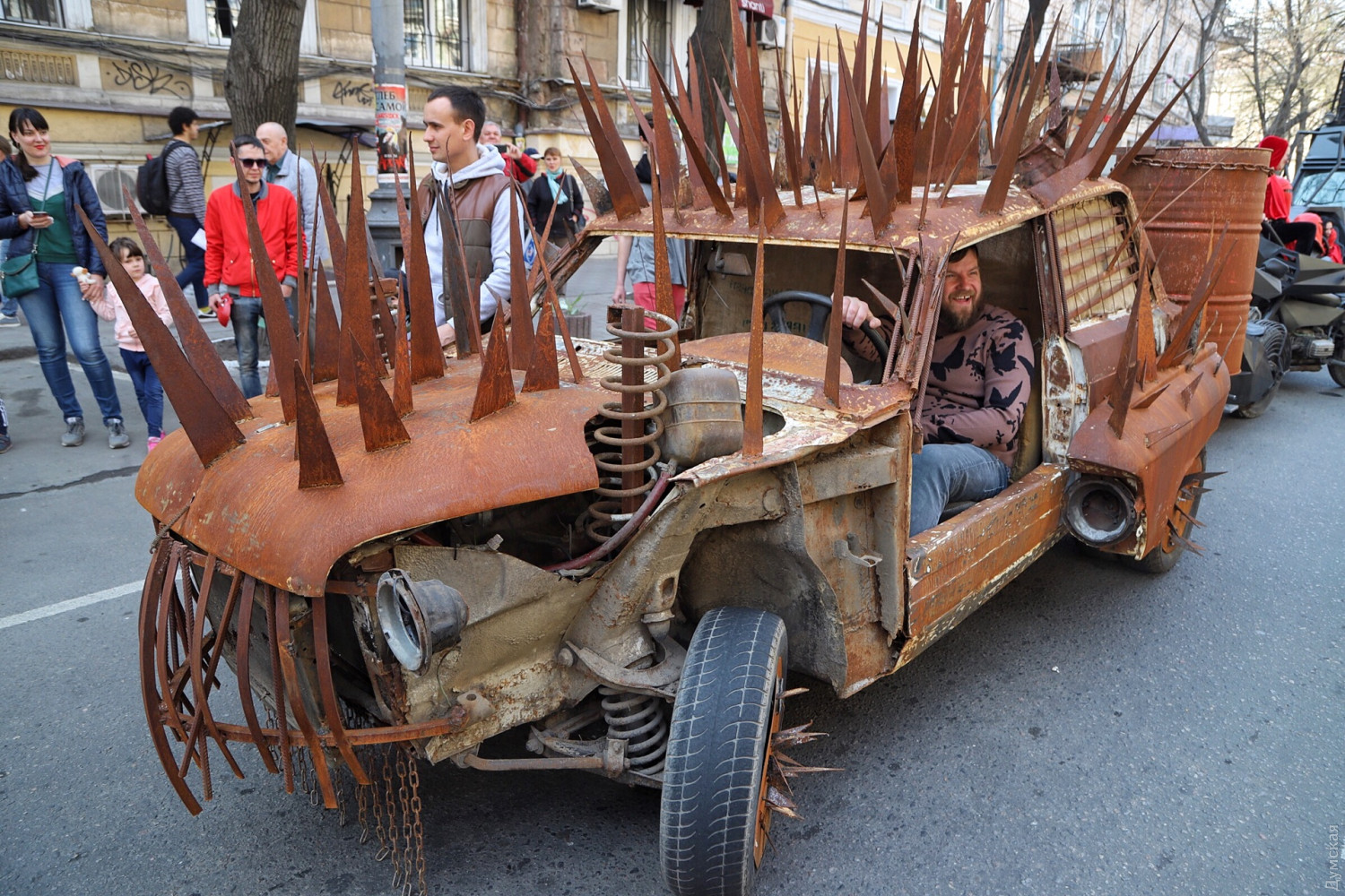 «Думская» продолжает первоапрельскую серию зарисовок «Лица Юморины». Мы уже рассказали о президенте-индейце с Еврейской улицы и о продавце воздуха с Дерибасовской. Теперь познакомимся с автором диковинной машины, покрытой металлическими шипами. Одессит Владимир — инженер по образованию. Своего монстра он сделал из ВАЗ-2107 специально для сегодняшнего парада, стараясь воссоздать автомобиль из компьютерной игры Мad Max. По словам Владимира, на это ушло две недели и запчасти от «Москвича» и горбатого «Запорожца». Несмотря на многочисленные переделки, автомобиль полностью на ходу. Более того, после сегодняшнего парада карьера ВАЗа не закончится — мастер планирует разобрать его и снова переделать, во что - пока не разглашается. СМЕРТЬ РОСІЙСЬКИМ ОКУПАНТАМ! Помітили помилку? Виділяйте слова з помилкою та натискайте control-enter Новини по цій темі: 1 квітня 2021: Невеселая Одесса: карантинные ограничения, отмененный парад и "Маски" возле Дюка (фоторепортаж, видео) 31 березня 2021: 1 апреля онлайн: сеть «Обжора» дарит подарки за шутки в соцсетях (новости компаний) 19 квітня 2020: Автор юморинного Морячка 30 лет назад уехал в Израиль, а сейчас рисует карикатуры на тему коронавируса (фото) |