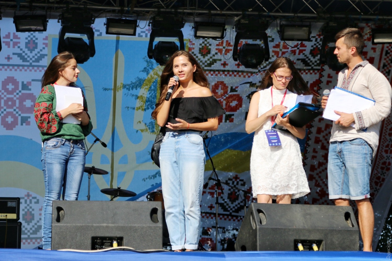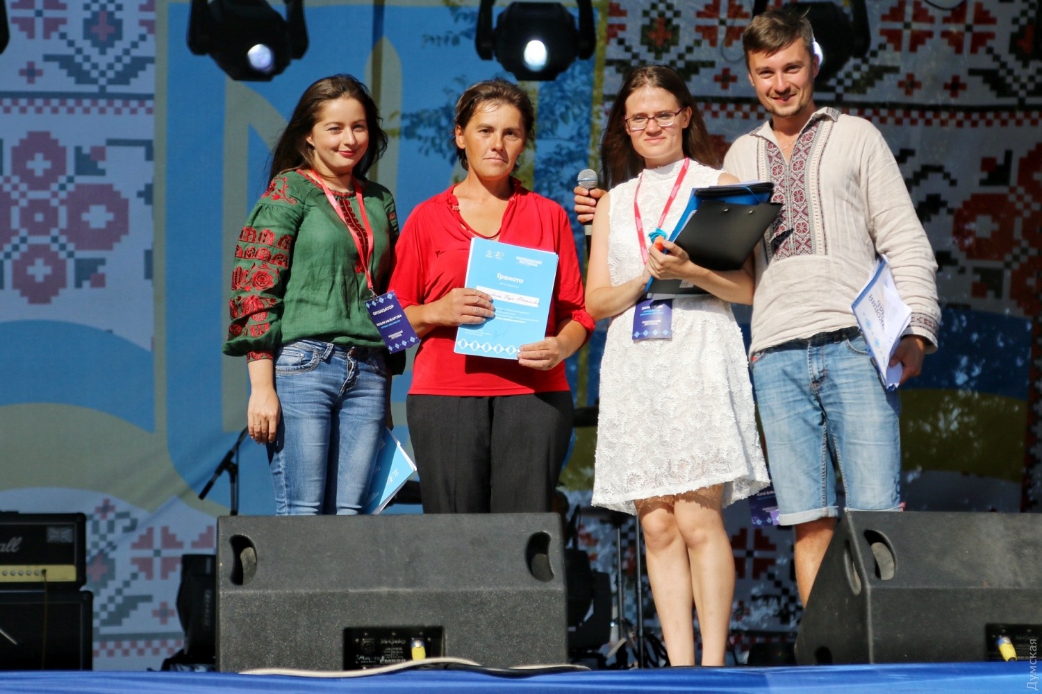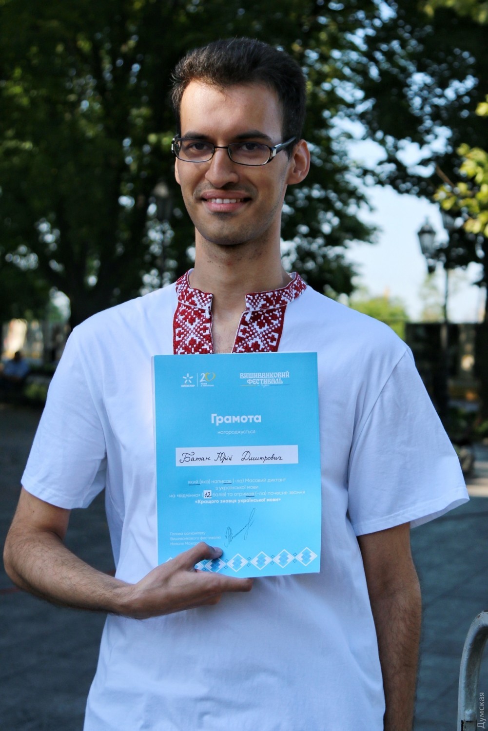 Только что со сцены Вышиванкового фестиваля объявили победителей прошедшего вчера массового диктанта по украинскому языку. Как передает наш корреспондент, лучшим из лучших второй год подряд стал аспирант Одесской юридической академии Юрий Батан. За идеальную работу без ошибок и помарок мужчина получил 12 баллов.