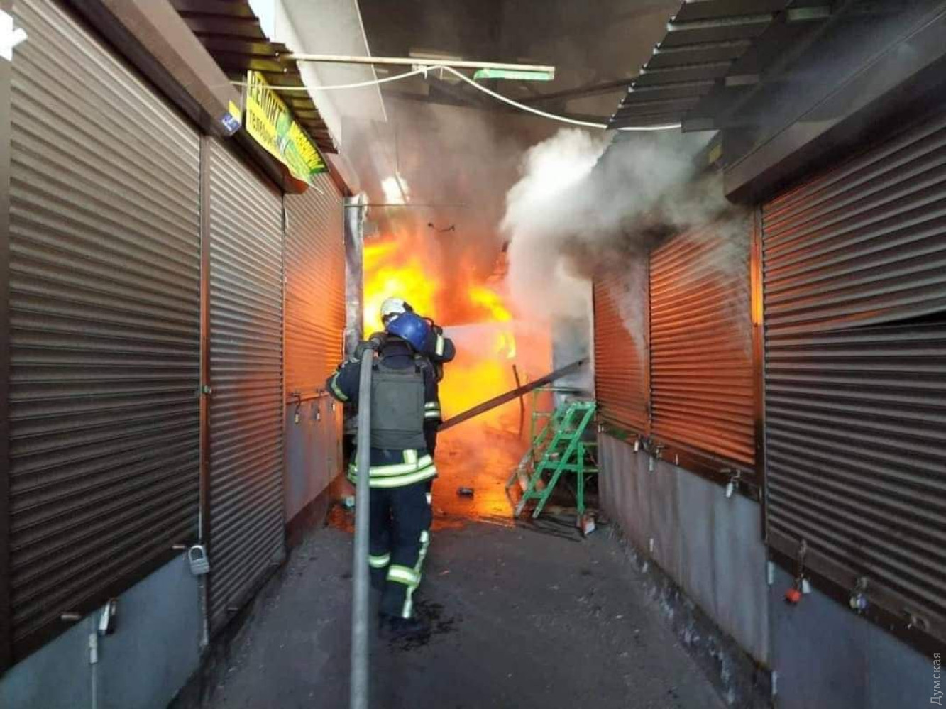 В Лисичанске спасатели ближе к вечеру смогли ликвидировать возгорание торговых павильонов рынка общей площадью 1000 кв. м.