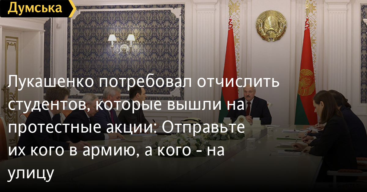 Лукашенко потребовал отчислить студентов, которые вышли на протестные акции: «Отправьте их кого в армию, а кого — на улицу»Непризнанный народом Беларуси президент Александр Лукашенко приказал принять санкции в отношении студентов и преподавателей, которые принимают участие в забастовке и протестах в Беларуси. Об этом сообщает официальный сайт «Белта». «Студенты: пришли учиться — учитесь. Кто хочет, тот пусть учится. Кто вышел в нарушение закона на несанкционированные акции, лишается права быть студентом. Пожалуйста, отправьте их, как я говорил, кого в армию, а кого — на улицу. Пусть ходят по улице. Но они должны быть отчислены из вуза. То же самое преподаватели, их тоже единицы, которые гадко себя ведут в вузах», — заявил Лукашенко. Он также заявил, что никого не надо уговаривать – ни рабочих, ни врачей. «В лучшем случае в этой ситуации мы их загоним под плинтус. И они потом опять оттуда вылезут. Поэтому пусть определяются, где они хотят жить, как они хотят жить и что делать», — добавил Лукашенко. Он также заявил, что Беларусь начинает сталкиваться с террористическими угрозами. Напомним, вчера в Беларуси началась общенациональная забастовка. Тихановская призвала белорусов не только не выходить на работу, но также блокировать дороги, отказаться от покупок в государственных магазинах, от государственных услуг, а также снять деньги с банковских счетов. Оппозиция готова прекратить забастовку при условии отставки Александра Лукашенко, прекращения насилия, освобождения политзаключенных. СМЕРТЬ РОССИЙСКИМ ОККУПАНТАМ! Заметили ошибку? Выделяйте слова с ошибкой и нажимайте control-enter |