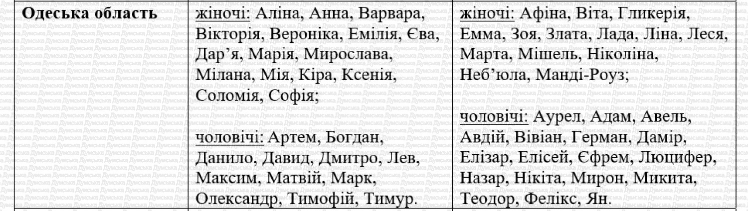 Так, серед незвичних імен, з якими будуть жити хлопчики з Одеської області, зустрічаються Аурел, Вівіан, Елізар, Елісей, Єфрем, Люцифер, повідомляє кореспондент «Думської».