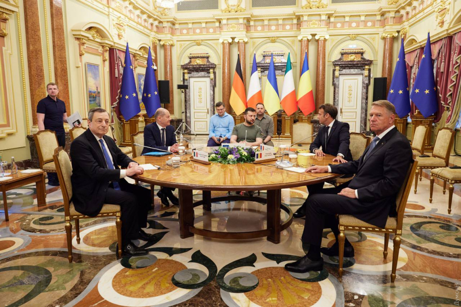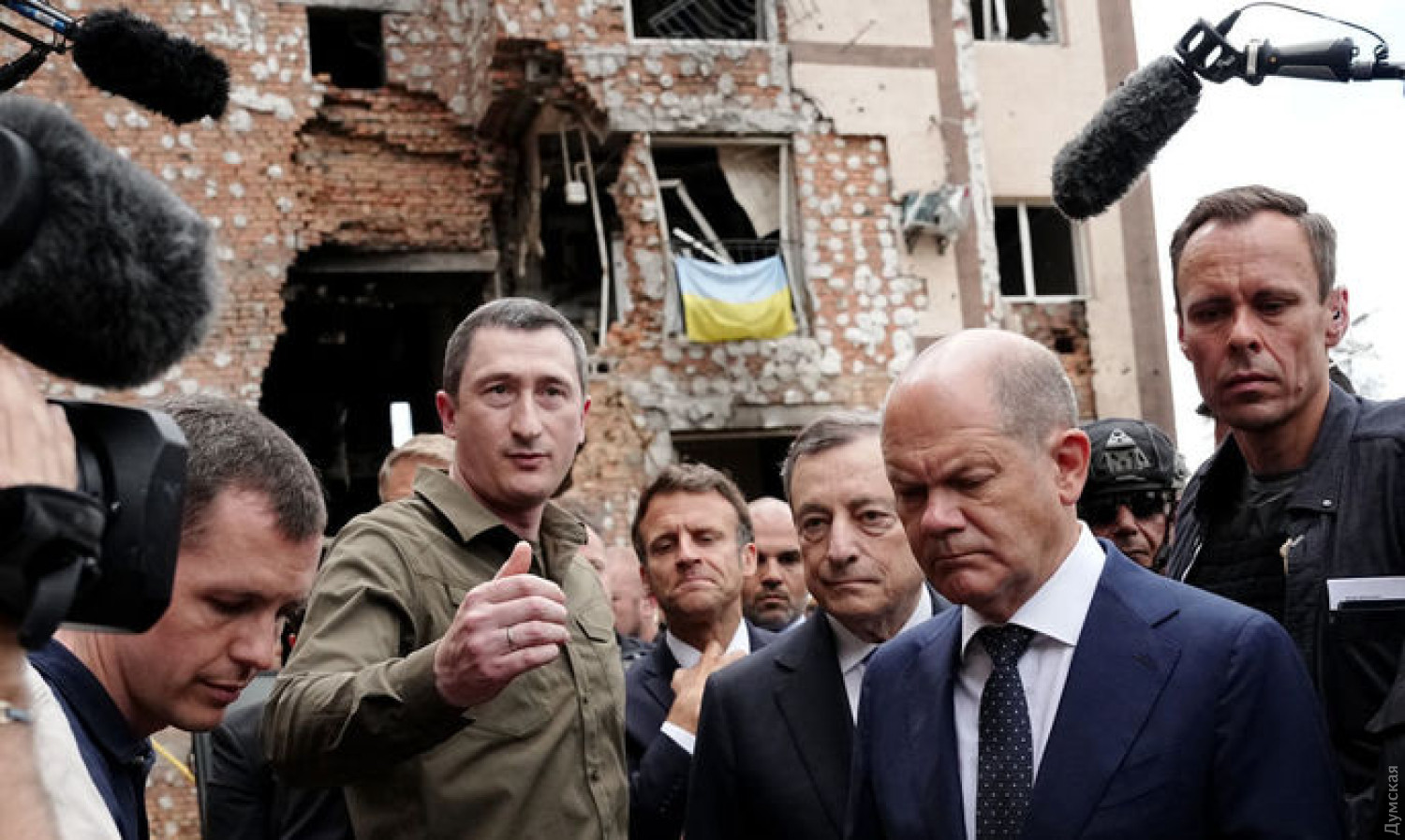 Макрон, Шольц и Драги посетили разрушенный Ирпень и провели переговоры с Зеленским (обновлено, фото)Лидеры «старой Европы» — президент Франции Эммануэль Макрон, канцлер Германии Олаф Шольц и премьер-министр Италии Марио Драги, а также президент Румынии Клаус Йоханнис после прибытия в Киев совершили поездку в Ирпень, где воочию увидели результаты пребывания там «русского мира». Разгромленный оккупантами город произвел яркие впечатления на европейских лидеров. «Все видели эти кадры опустошенного города, который, в то же время, героический город — потому что здесь, как и во многих местах, украинцы сдержали наступление российской армии на Киев. Нужно отметить героизм и военных, и гражданских украинцев… И здесь можно видеть следы варварства… Нужно, чтобы Украина могла сопротивляться и получать преимущество», — заявил Макрон. «Это многое говорит об агрессивной войне России, которая просто нацелена на уничтожение. Мы должны помнить об этом все, принимая решения», — сказал Шольц. «Страшно, какие разрушения наносит эта война. И еще хуже, когда видишь, насколько бессмысленно это насилие», — добавил канцлер. «Нет слов, чтобы описать невероятную человеческую трагедию и ужасные разрушения, которые мы видели сегодня в Ирпене. Я настоятельно призываю привлечь к ответственности всех российских преступников перед международным уголовным правосудием, которое Румыния полностью поддерживает», — заявил Клаус Йоханнис. Итальянский премьер-министр, в свою очередь, пообещал, что его страна поможет восстановлению Украины после войны. «Это место разрушения, но также и надежды. Многое из того, что мне здесь рассказывали, касалось будущего и реконструкции. Война объединила людей, теперь они могут делать то, что до войны было невозможно. Мир - на вашей стороне», — подчеркнул он. После визита в Ирпень, высокопоставленные гости прибыли в Мариинский дворец для встречи с Владимиром Зеленским. Переговоры длились несколько часов. По информации главы Офиса президента Украины Андрея Ермака, они завершились успешно. «Украина имеет стойкую поддержку международной коалиции. Мы передали лидерам государств полный пакет санкционных предложений против России, которые подготовила международная группа Макфола-Ермака. Должны усиливать давление на агрессора, работать над седьмым пакетом санкций с газовым эмбарго. Европа сегодня вместе с Украиной. Победим», — заявил Ермак. Также встречу прокомментировал Зеленский. «Мы говорили о потребностях Украины, о мощном оружии, нам нужна большая помощь. Каждое оружие означает спасенные жизни, каждое отложенное решение дает возможность россиянам убивать украинцев», – заявил президент. Отметим, во время визита президента Франции в Киев министр-делегат по делам Европы в МИД Франции Клеман Бон заявил о поддержке его страной предоставления Украине статуса кандидата в члены Евросоюза. ОБНОВЛЕНО В 17:47. Эммануэль Макрон заявил, что страны, лидеры которых посетили сегодня Киев, единогласно выступают за предоставление Украине статуса страны-кандидата на вступление в Европейский Союз. Также он сообщил, что Евросоюз не будет будет требровать от Украины территориальных уступок ради завершения войны. Макрон добавил, что Франция передаст Украине дополнительно шесть САУ «Цезарь». СМЕРТЬ РОСІЙСЬКИМ ОКУПАНТАМ! Помітили поми