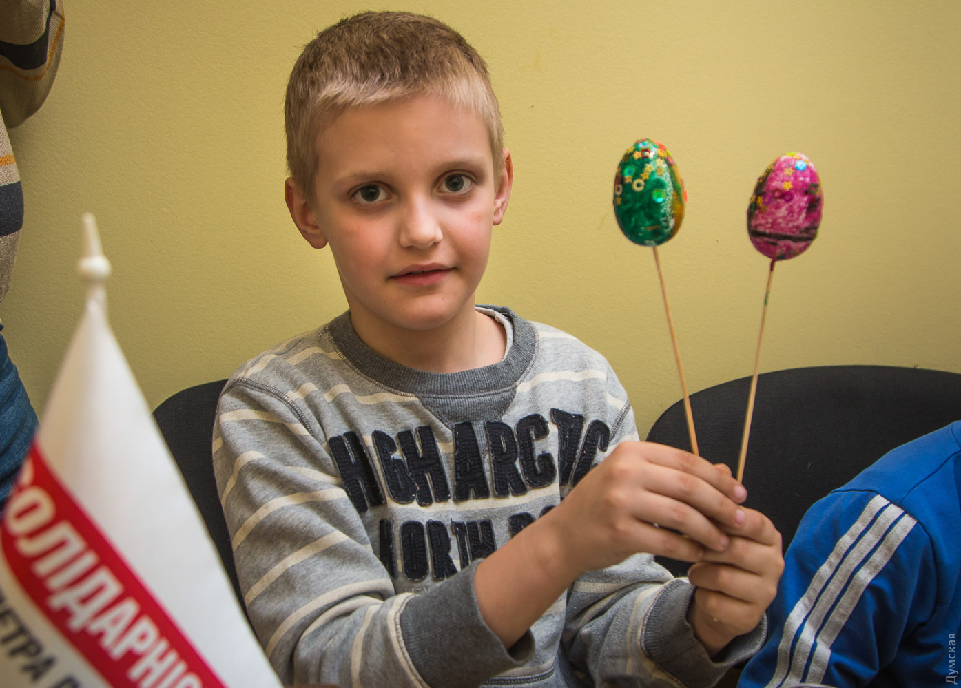 Сегодня днем в офисе областного отделения партии Блок Петра Порошенко «Солидарность» — необычное оживление. Маленькие девчонки и мальчишки раскрашивают пасхальные писанки и пишут послания добра и мира на открытках. Эти небольшие сувениры отправятся на передовую в Станицу Луганскую, чтобы поддержать военнослужащих, защищающих целостность нашей страны.