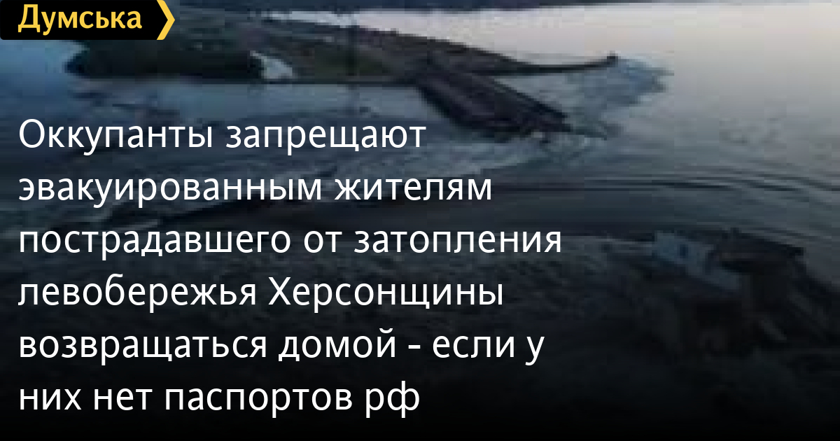 Окупанти забороняють евакуйованим жителям постраждалого від затоплення лівобережжя Херсонщини повертатися додому — якщо у них немає паспортів рфЖителі захоплених населених пунктів лівобережжя Херсонщини, які змушені були евакуюватися після підриву російськими окупантами дамби Каховської ГЕС, не можуть повернутися до своїх домівок, якщо не мають паспортів країни-агресора. Таке розпорядження видала окупаційна влада регіону, повідомила заступник міністра оборони України Ганна Маляр. «Водночас вони змушують постраждалих від підтоплення і примусово виселених зі своїх будинків громадян України переїжджати в Росію або на тимчасово окуповану територію АР Крим», — зазначила вона. А в Луганській області громадян України, які живуть на захоплених територіях і відмовляються отримувати російські паспорти, примусово виселяють із власних будинків під приводом заборгованості за комунальні послуги. «Зокрема, у Старобільську після виселення в такий спосіб законних власників житла туди заселяються громадяни РФ», — пояснила Маляр. СМЕРТЬ РОСІЙСЬКИМ ОКУПАНТАМ! Помітили помилку? Виділяйте слова з помилкою та натискайте control-enter |