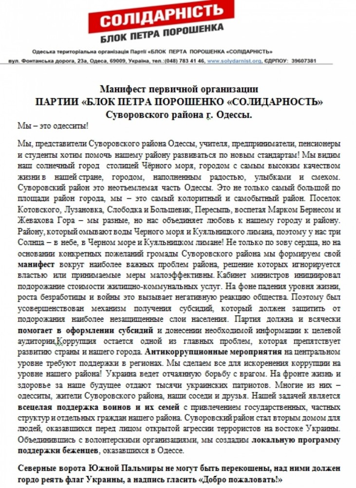 Организация партии «Блок Петра Порошенко «Солидарность» в Суворовском районе Одессы, как и анонсировала, разработала свой манифест. «Мы формируем свой манифест вокруг наиболее важных проблем района, решение которых игнорируется властью или принимаемые меры малоэффективны», — говорится в документе. Среди основных направлений деятельности организации в манифесте обозначены: помощь в оформлении субсидий в связи с повышением стоимости жилищно-коммунальных услуг, антикоррупционные мероприятия, поддержка воинов АТО и их семей, а также локальная программа помощи вынужденным переселенцам. СМЕРТЬ РОСІЙСЬКИМ ОКУПАНТАМ! Помітили помилку? Виділяйте слова з помилкою та натискайте control-enter |