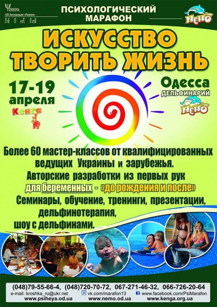 В Одессе пройдет психологический марафон «Искусство творить жизнь» (на правах рекламы)С 17 по 19 апреля в Одессе будет проходить Марафон психологических, оздоровительных и образовательных программ «Искусство творить жизнь». Как сообщают организаторы, в программе марафона — уникальные методики и эффективные тренинги признанных мастеров психологии. «Идея создания Марафона психологических практик возникла у инициативной группы Ассоциации «Психея» в результате многолетнего сотрудничества в рамках проведения медико-психологических форумов «Жизнь до рождения и после», многие из которых проходили в дельфинарии «Немо» с первых дней его основания», — говорится в сообщении. Миссия марафона – интеграция современных психологических практик в социальную культуру, презентация инновационных направлений психотерапии, творческая актуализация личности. Проект рассчитан на всех, кто ощущает потребность в саморазвитии, познании, построении гармоничных межличностных отношений, творческой самореализации. Для будущих родителей, ответственно готовящихся к появлению малыша, родителей с детьми, которым близки идеи гармоничного развития малышей, саморазвития, творчества и здорового образа жизнь. И, конечно, для специалистов: психологов, педагогов, медиков. «Программа форума — очень насыщенна и разнообразна. Она включает несколько тематических площадок, где каждый сможет найти себе занятие по душе. И что немаловажно, встретиться снова или познакомиться с единомышленниками», — подчеркивают организаторы. Так, на марафоне будут представлены следующие направления: СМЕРТЬ РОССИЙСКИМ ОККУПАНТАМ! Заметили ошибку? Выделяйте слова с ошибкой и нажимайте control-enter |