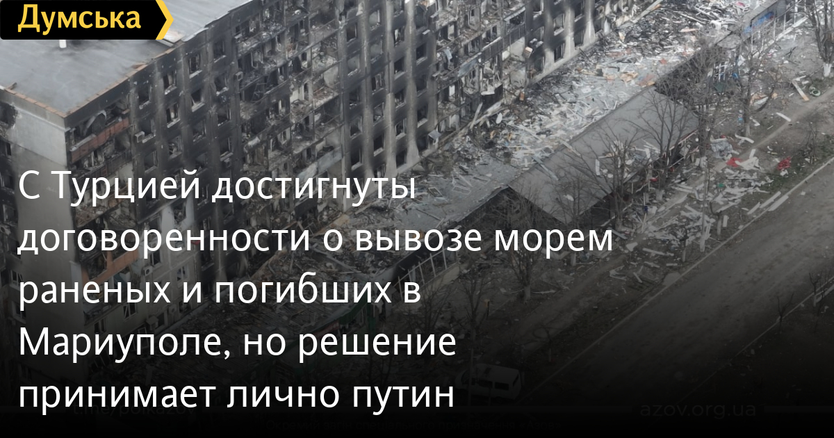 С Турцией достигнуты договоренности о вывозе морем раненых и погибших в Мариуполе, но решение принимает лично путинДоговоренности о вывозе погибших и раненых из осаждаемого российскими нацистами Мариуполя достигнуты с Турцией. Об этом в интервью украинским журналистам рассказал Верховный главнокомандующий Владимир Зеленский. По его словам, Украина искала посредника, которого будут воспринимать оккупанты. «Турция готова на сегодня вывезти кораблями раненых и убитых, перевезти их из Бердянска. К Мариуполю подойти невозможно. А до Бердянска всех необходимо довезти, — сказал Президент. — Вся наша инфраструктура готова к этому. Ждем согласования от путина. Я говорил с Эрдоганом, а Эрдоган разговаривает с ним». Владимир Зеленский отметил, что в ближайшие дни будет понятно, удалось ли договориться с путиным. Решение принимает лично он. Также Президент сказал, что вопрос военной деоккупации Мариуполя сейчас озвучить он не может. «Парни, которые находятся там и которым очень тяжело, об этом прекрасно знают. Мы реально на контакте почти ежедневно Они очень крепкие, но им очень тяжело», — отметил Президент. СМЕРТЬ РОСІЙСЬКИМ ОКУПАНТАМ! Помітили помилку? Виділяйте слова з помилкою та натискайте control-enter |