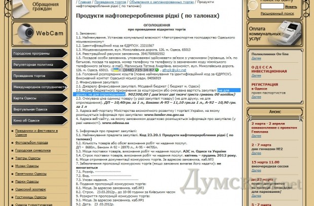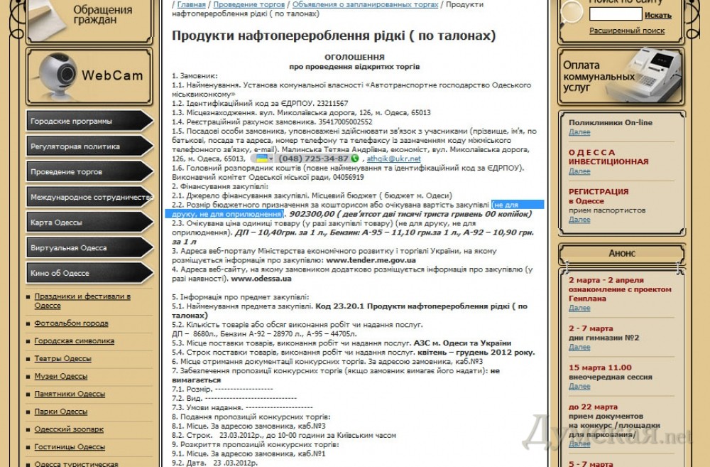 Литр ДТ, ожидают на Думской площади, обойдется горбюджету в 10,4 грн; бензина А-95 – в 11,1 грн, 92-го – 10,9 грн. Это в среднем на 30-40 копеек дороже, чем было сегодня на АЗС Одессы и области. Интересно, что мэрия впервые, объявляя тендер, обнародовала сумму предполагаемых бюджетных затрат (так называемое «бюджетне призначення»). Впрочем, судя по примечанию «не для печати», указанному в соответствующей графе, произошла страшная ошибка – на сайт попало то, что не было предназначено для широкой общественности.