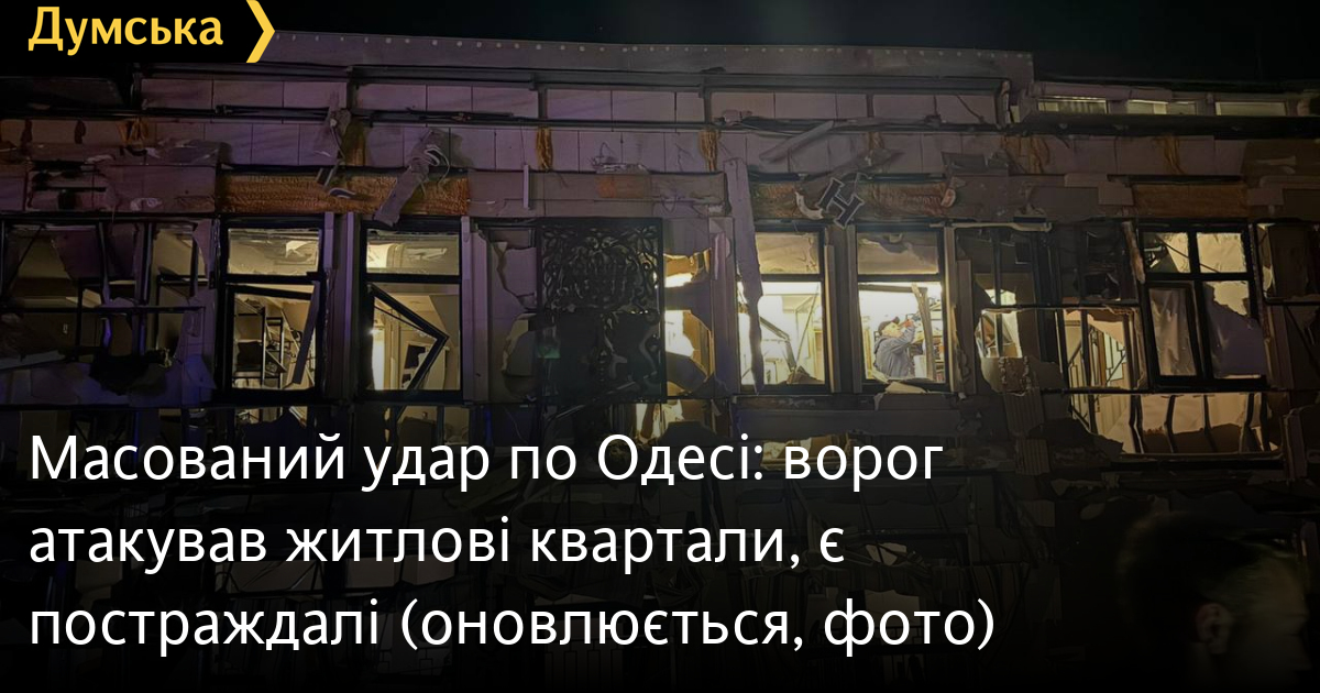 Масований удар по Одесі: ворог атакував житлові квартали, є постраждалі (оновлюється, фото)Масованого удару дронами по житлових кварталах та об’єктах цивільної інфраструктури Одеси завдав ворог вночі. Як повідомили у військовій адміністрації, за медичною допомогою звернулися 10 осіб, серед них двоє дітей. Найбільші руйнування зафіксовано в Приморському районі. Пошкоджено житлові будинки та готель у центрі міста. Також під ударом опинилися Хаджібейський та Київський райони. Там постраждали висотки, приватні будинки та автомобілі. ОНОВЛЕНО О 8:25. Кількість постраждалих зросло до 11, серед них 2 дітей. Дісталося і фунікулеру на Приморському бульварі Пошкодження отримала також припортова територія. СМЕРТЬ РОСІЙСЬКИМ ОКУПАНТАМ! Помітили помилку? Виділяйте слова з помилкою та натискайте control-enter |