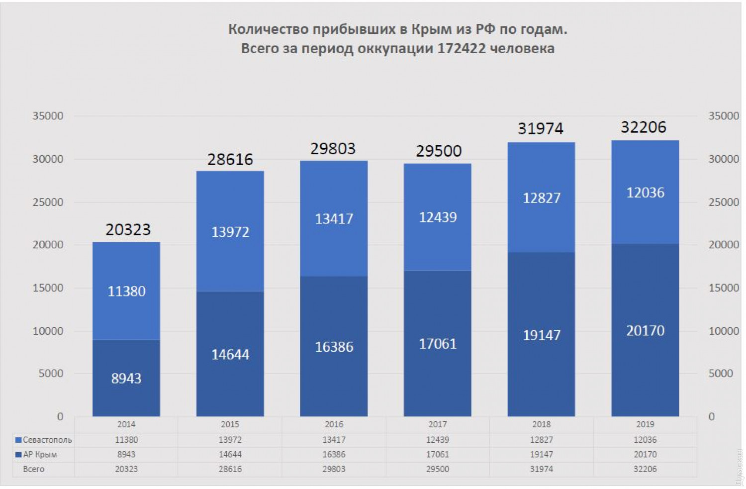 Россияне переместили в оккупированный Крым почти 200 тысяч человек: это нарушение Женевской конвенции172 422 человека въехали в Крым из России после аннексии полуострова. Это только те, кто зарегистрировался в оккупационных органах власти, сообщает Крымская правозащитная группа. По данным оккупационнного «Крымстата», на полуостров в 2019 году въехало 32 206 человек, из них в АР Крым – 20 170 человек, а в Севастополь – 12 036. Всего за период аннексии из России в Крым въехало 172 422 человека, в том числе в АР Крым – 96 351 человек, в Севастополь – 76 071. «Перемещение населения оккупирующей державы на оккупированную территорию нарушает статью 49 Женевской конвенции о защите гражданского населения во время войны. Процесс такого перемещения меняет демографическую картину на оккупированной территории», – заявляют правозащитники. В октябре 2019 года ООН признала, что Россия нарушает Женевские конвенции из-за изменения демографии Крыма. Ранее сообщалось, что в 2018 году миграционный прирост в аннексированный Крым за счет регионов соседней России оказался примерно в полтора раза больше, чем в 2017. Всего за год на полуостров официально переехало чуть более 19 тысяч россиян, в то время как в Россию уехали 17,5 тыс. крымчан. В 2017 году в Крым переселились примерно 17 тысяч россиян, а 16 тысяч крымчан покинули полуостров. СМЕРТЬ РОСІЙСЬКИМ ОКУПАНТАМ! Помітили помилку? Виділяйте слова з помилкою та натискайте control-enter |
