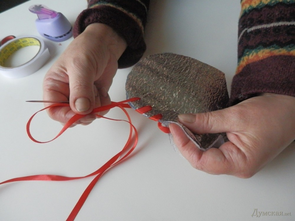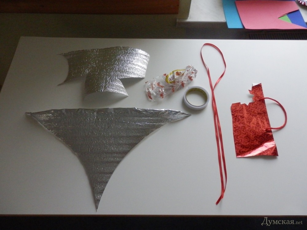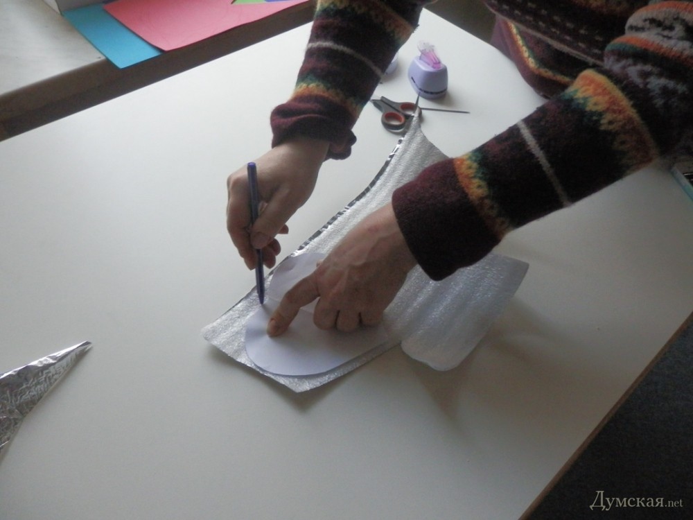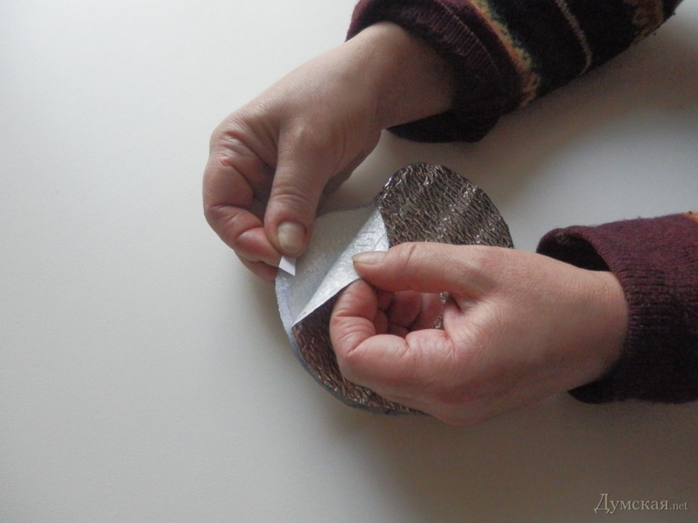 Итак, как уверяют одесские мастера по части хенд-мейда, украшение, сделанное своими руками, порой ничуть не хуже дорогущего магазинного разнообразия, а по энергетике и вовсе в сто раз лучше. Причем, сделать его можно не выходя из дома, и особо не тратясь на материалы. Игрушку из отходов предложила нам рукодельница Татьяна. Для этого нам понадобятся остатки фольгированного утеплителя и полиэтиленовые пакеты. В качестве инструментария пригодятся ножницы, цыганская игла, степлер и двухсторонний скотч.