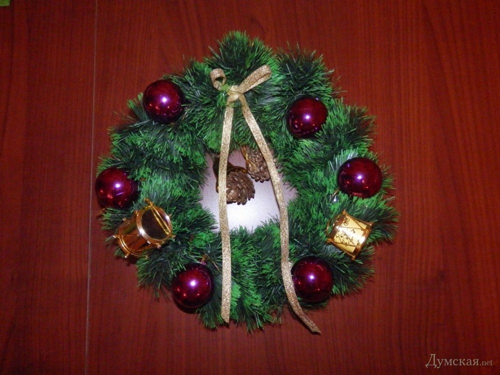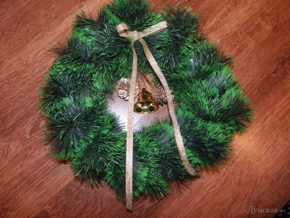 Украшение №2 – рождественский венок, мелькающий во всех американских фильмах. Сделать его можно как из живых веток, так и из обыкновенного дождика. Для этого понадобится каркас из картона либо лески. Проволоку придется обмотать какой-то тканью и для прочности скрепить нитками. Сверху идет слой любого имеющегося дождика — венок можно сделать как зеленым, так и красным, серебристым или голубым. Украсить веночек можно, опять же, тем что есть под рукой– ленточками, шишками, елочными шарами, колокольчиками.
