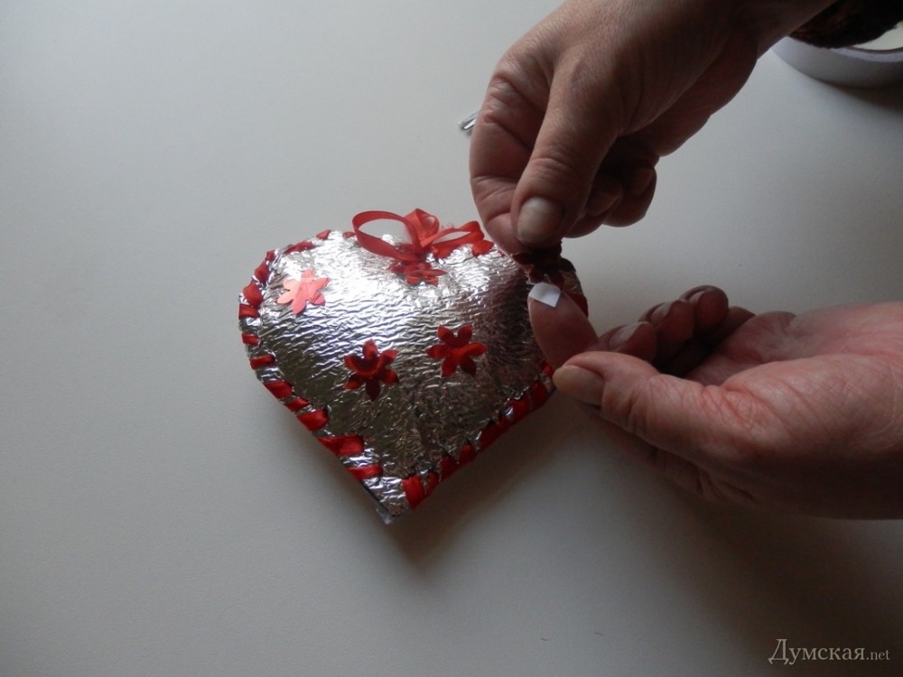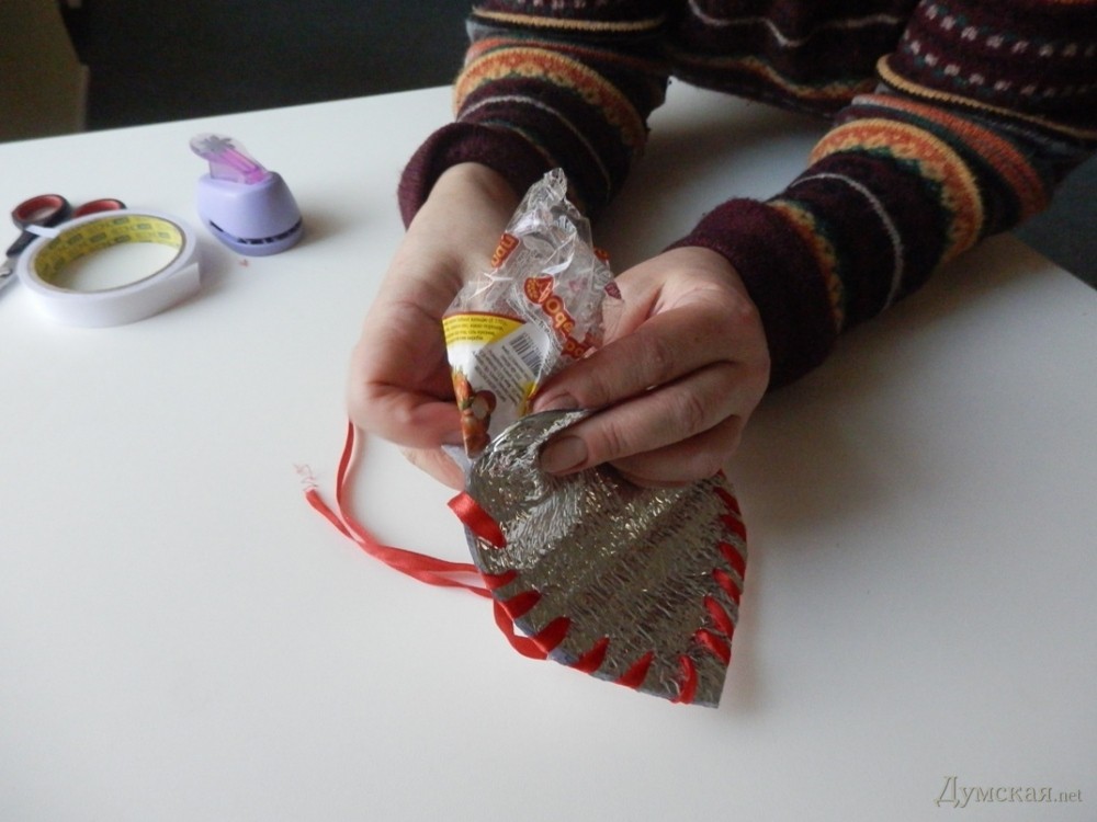 Для начала вырезаем форму игрушки из бумаги, потом обводим ее карандашом на утеплителе, предварительно сложив его вдвое. Вырезанную форму склеиваем изнутри скотчем, оставив одно небольшое отверстие, накладываем швы по краям изделия красной лентой, и набиваем игрушку кульками. Сверху украшаем по своему желанию.