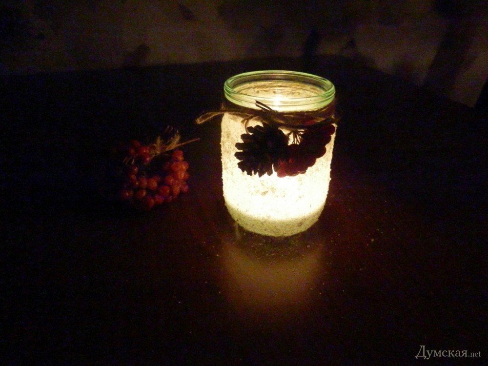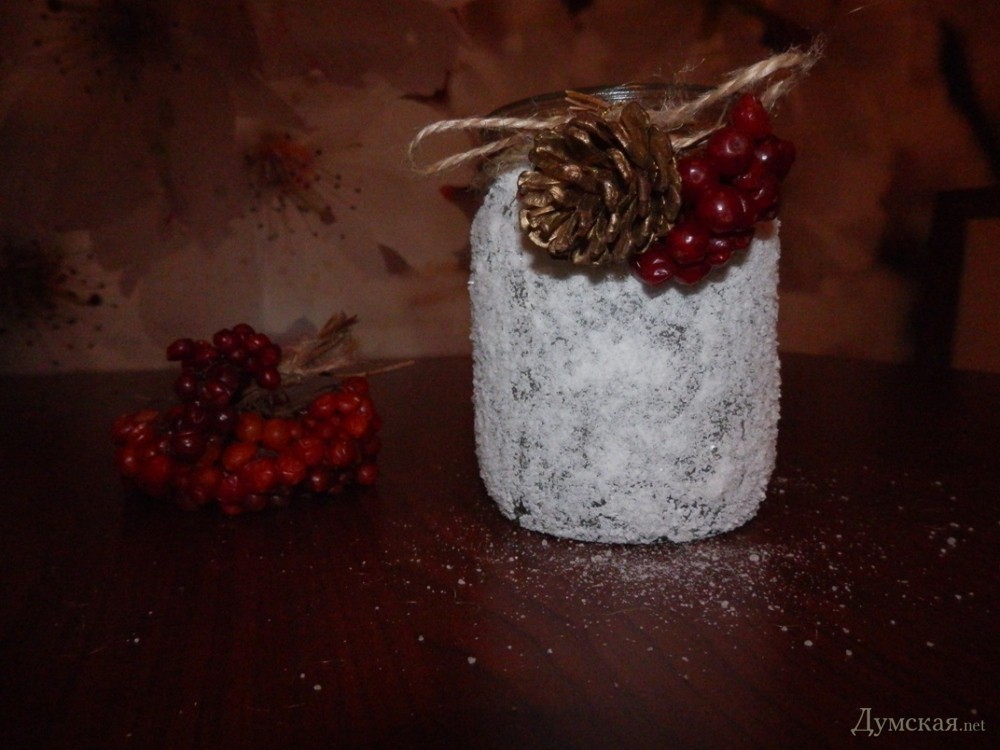 Третий вариант новогоднего хенд-мейда – подсвечник из банки с эффектом налипшего снега. Роль снежных хлопьев выполнит обычная крупная соль. Она будет отлично держаться на банке, если перед этим смазать ее клеем. Украсить подсвечник можно эко-веревочками из мешковины и даже живой калиной. Пучок, к слову, стоит всего 5 грн.