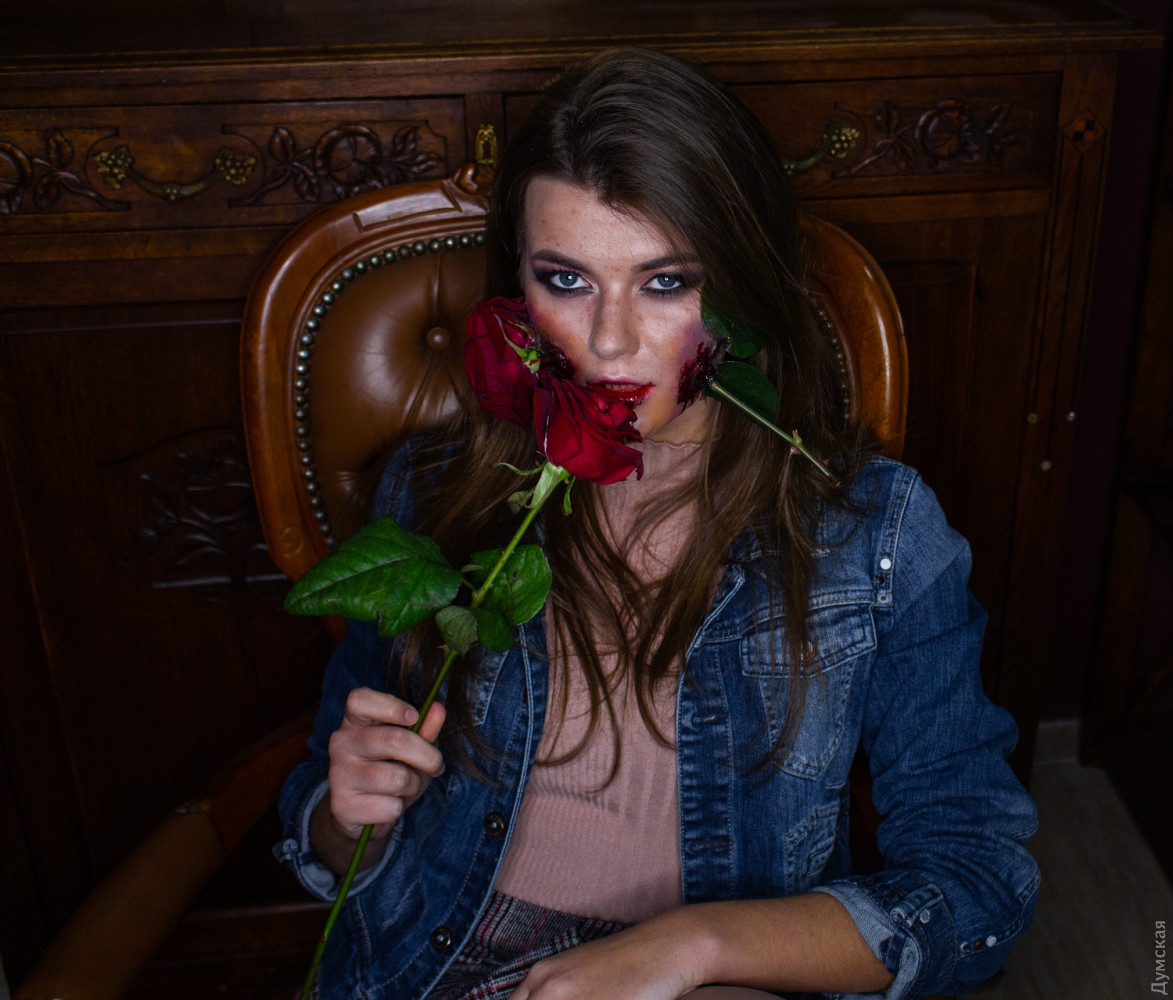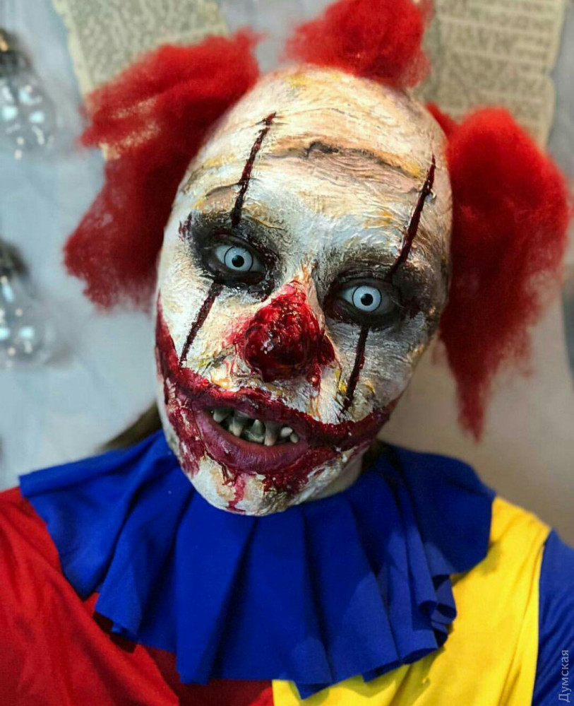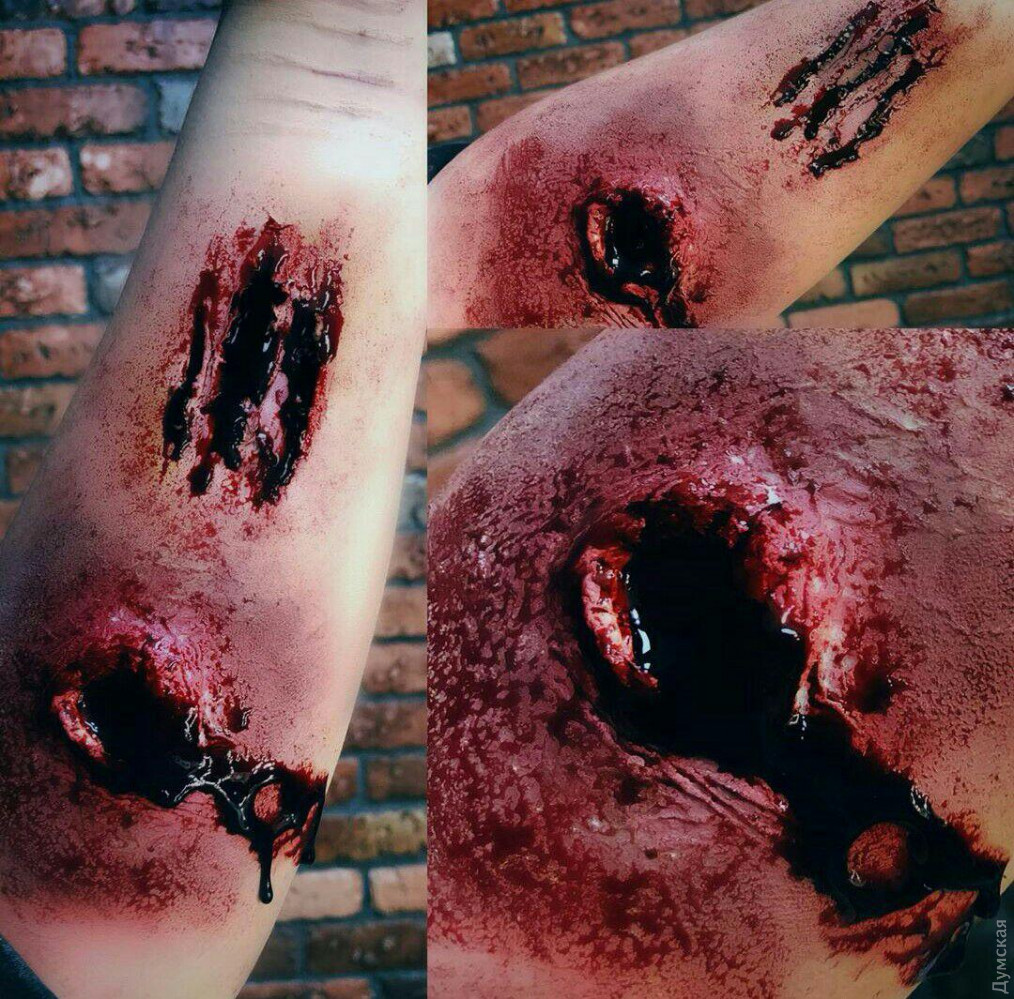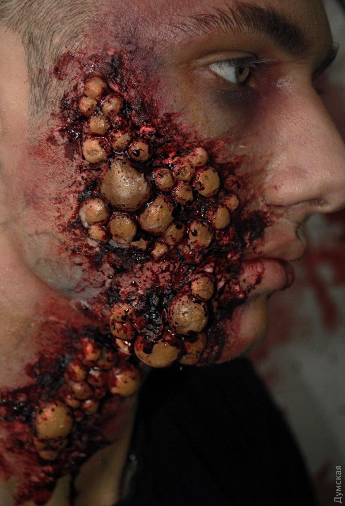 В преддверии самого страшного праздника, «Думская» решила написать о тех, для кого Хэллоуин — это не один день в году, а призвание по жизни. Героиня нашего сюжета – мастер студии пластического грима Александра Карпунина – юная девушка, которая способна любую красавицу или красавца превратить в чудовище. Мастерская хоррора расположилась в здании одного из бизнес-центров на Среднефонтанской. Уже издалека понятно, что здесь что-то «не чисто» — к студии ведут стилизованные кровавые следы, а само помещение украшено в лучших традициях ужастика «Байки из склепа». Тут и мертвецы, выглядывающие из-за могильных надгробий, и тарантулы, и скелеты. На входе висит настораживающая надпись: «входите, если посмеете». Но мы не из пугливых — пережили и голые перфомансы, и пенис-арты, и даже вид реконструированной Аркадии, а потому смело переступаем порог. Но вместо «обители зла» попадаем в студию с милейшей атмосферой. Под песни Элвиса Пресли, звучащие из ретро-проигрывателя, знакомимся с обстановкой студии и ее хозяйкой. Саше всего 22 года. По образования она – морской менеджер. В Морскую академию девушка поступила по настоянию родителей, почти все члены ее семьи так или иначе связаны с морем. Но уже на третьем курсе, проходя практику в крюинге и логистической компании, Саша твердо решила, что эта профессия не для нее. «Я поняла, что не хочу на кого-то работать и реализовывать чужие планы. Для меня это чистая трата времени впустую», — рассказывает девушка. Альтернатива была всегда, ведь с самого детства Александра занималась творчеством. В 8 классе она сделала работу по декоративно-прикладному искусству с вышивкой, лепкой из глины и элементами из папье-маше для конкурса имени Тараса Шевченко. Работа получила первое место в Одесской области. А отношения с визажем у нее начались в 12 лет – пока сверстницы еще игрались в куклы, Саша уже старательно выводила стрелки и скульптурировала лицо. А будучи студенткой, Александра поступила в школу актерского мастерства, где среди прочих дисциплин значился киношный грим. Именно это направление, а точнее хоррор-грим полностью захватило девушку. За четыре года, которые она трудится в этой сфере, Саша создала около сотни страшных образов, а не так давно основала собственную студию, где проводит авторские мастер-классы. КРОВЬ ИЗ КРАСИТЕЛЕЙ И ГЛАЗУРИ Сотрудники бизнес-центра уже привыкли к соседству со студией Александры и даже перестали шарахаться при виде выходящих отсюда зомби или страшных клоунов. Для того чтобы добиться нужного эффекта и сделать своих клиентов как можно более страшными, на вооружении у Александры множество специальных инструментов и флакончиков. Центральное место среди них, конечно, отведено бутафорской крови, без которой в пластическом гриме как без рук. Делается кровь из красителей и глазури, а на вкус – сладкая. Еще один маст-хев киношного гримера – латекс. «Некоторые ютуб-блогеры предлагают заменять его клеем ПВА. Когда я такое вижу, я прихожу в ужас, ведь наносить такой клей на лицо категорически запрещено, это, конечно, дешево, но очень опасно. Когда мне нужно много латексных накладок, я делаю их из желатина с глицерином. Это очень удешевляет работу и к тому же такая смесь полезна для кожи», — делится секретами Саша. Также в арсенале гримера множество кистей, которые проходят обязат