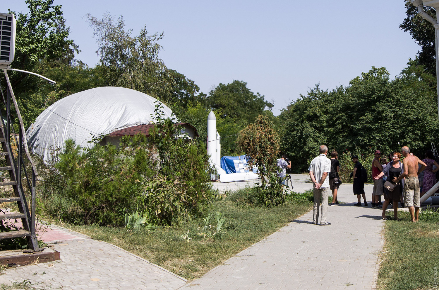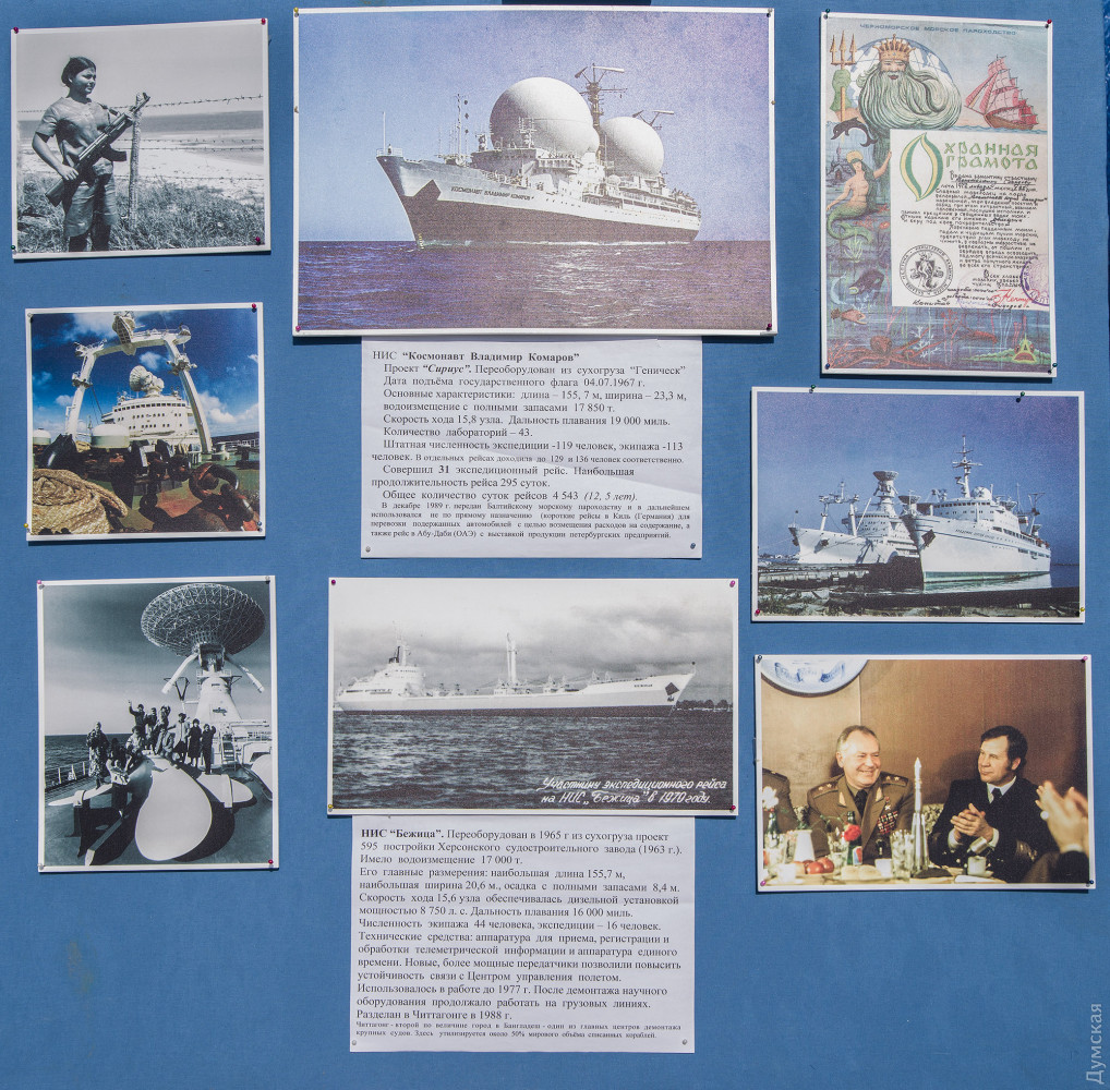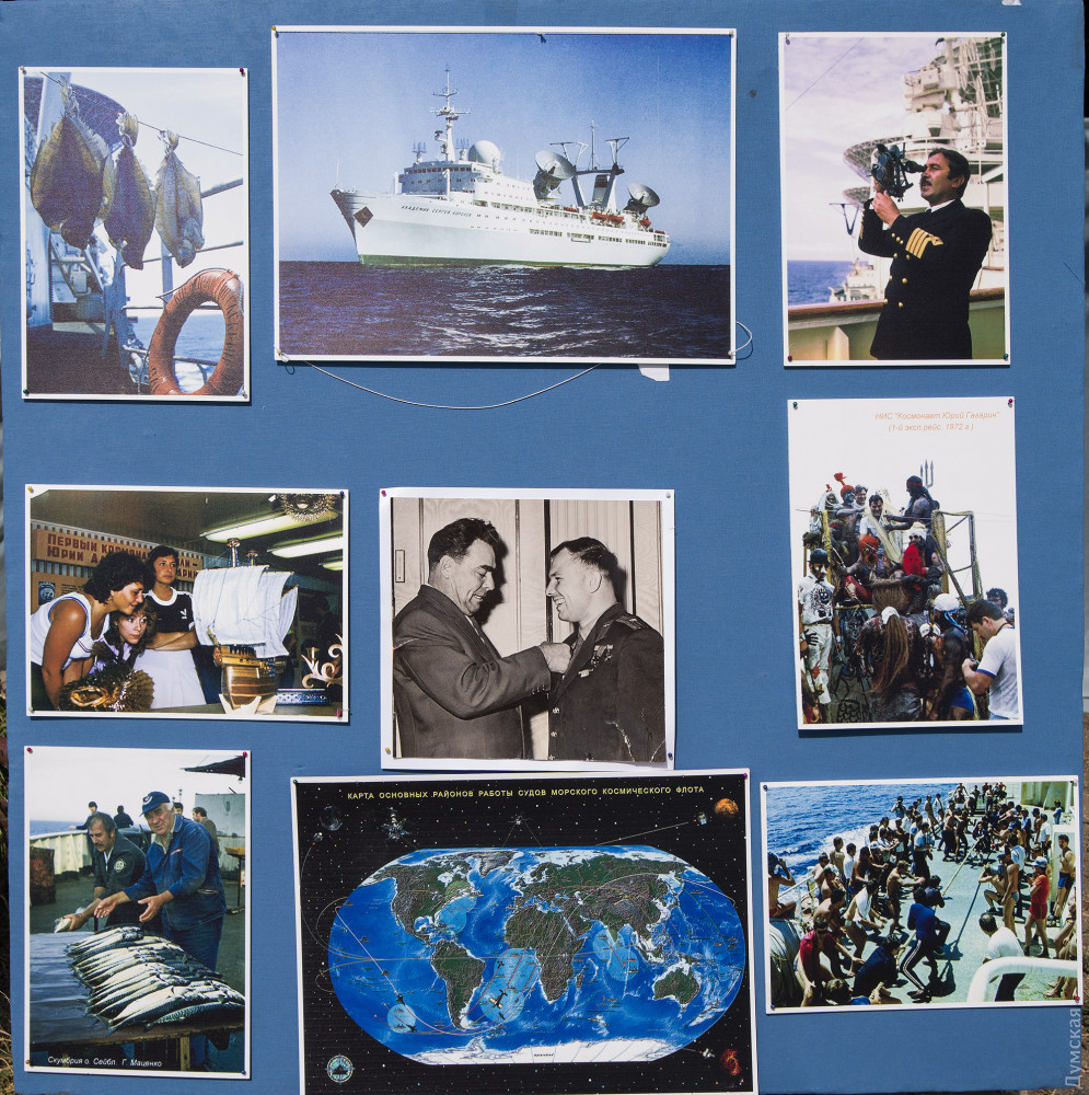 Для меня, как то странноватно выглядят стенды возле макета белой фигни, с виду напоминающей большую игрушечную ракету, на них много фотографий имеющих призрачную связь не только с Одессой, но и Украиной вцелом, каким боком Брежнев, вручающий орден Гагарину? И тому подобные старые фотографии то штатовских кораблей, то ещё чего то там, такое впечатление, что выставили « находки» со шкафа выкинутого кем то на свалку и ни одного фото ныне покойного Украинского космонавта?! И все это рядом с имитацией полярного ледяного домика. Рядом можно выставить бак от самолёта, найденного в колоннаде и ещё какой то старинной фигни, ясно одно, что кому то очень скучно на пенсии