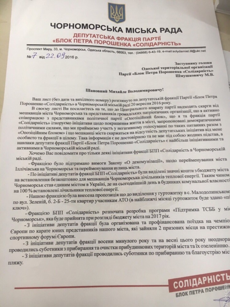 После получения этого письма восьмерку черноморских «порошенковцев» собрал у себя мэр Валерий Хмельнюк и чуть ли не силой заставил подписаться под ответным документом, в котором критикуется уже областная организация. Часть депутатов колебалась, но городской голова нашел нужные аргументы и собрал подписи.