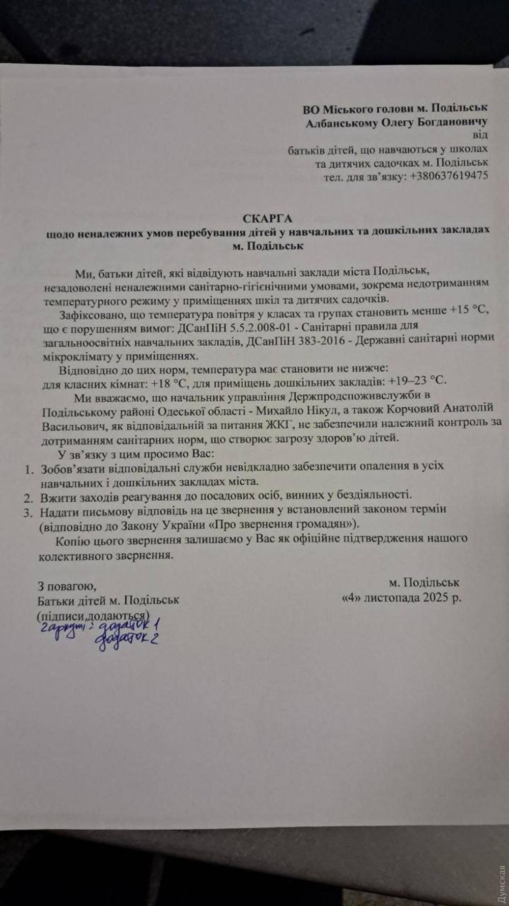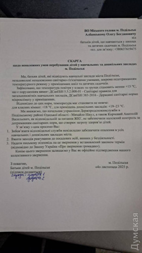 Змерзають в шапках на уроках: на Одещині батьки вимагають негайно увімкнути опалення у школах та садочкахРозв'язати проблему критично низької температури у садочках та школах Подільська вимагають десятки батьків. Люди підписали колективну скаргу на ім'я в.о. міського голови Олега Албанського, повідомляє кореспондент «Думської». «Діти сидять на уроках у куртках і шапках. Ми вимагаємо негайного опалення!», — йдеться у зверненні. Температура у класах та приміщеннях, за словами батьків, менше +15°C. Це не відповідає вимогам державних санітарних норм та правил. Як стало відомо «Думській», котельні у Подільську вже готові до запуску, а розпочати опалювальний сезон планують 6 листопада. У міськраді зазначили, що наразі очікують остаточного погодження з Одеською обласною військовою адміністрацією. Зазначимо, Подільськом фактично керує коаліція з «слуг народу» і забороненої ОПЗЖ: мер міста Олег Албанський — соратник президента, а одна з його заступниць Таїсія Скрипник — «опо». За нашою інформацією, це стало можливим після того, як колишній міський голова Анатолій Іванов, щоб уникнути кримінального переслідування, фактично домовився з центральною владою і призначив секретарем міської ради Олега Албанського. Згодом Албанський і став керувати Подільськом. Детальніше про це ми писали тут. Як раніше писала «Думська», після російської атаки на Подільск в ніч на 29 жовтня в Подільській міській раді відзвітували про екстрене нічне засідання, яке нібито пройшло о 4 ранку. Виявилося, керівник міста Олег Албанський прибув до будівлі не раніше 9:00.