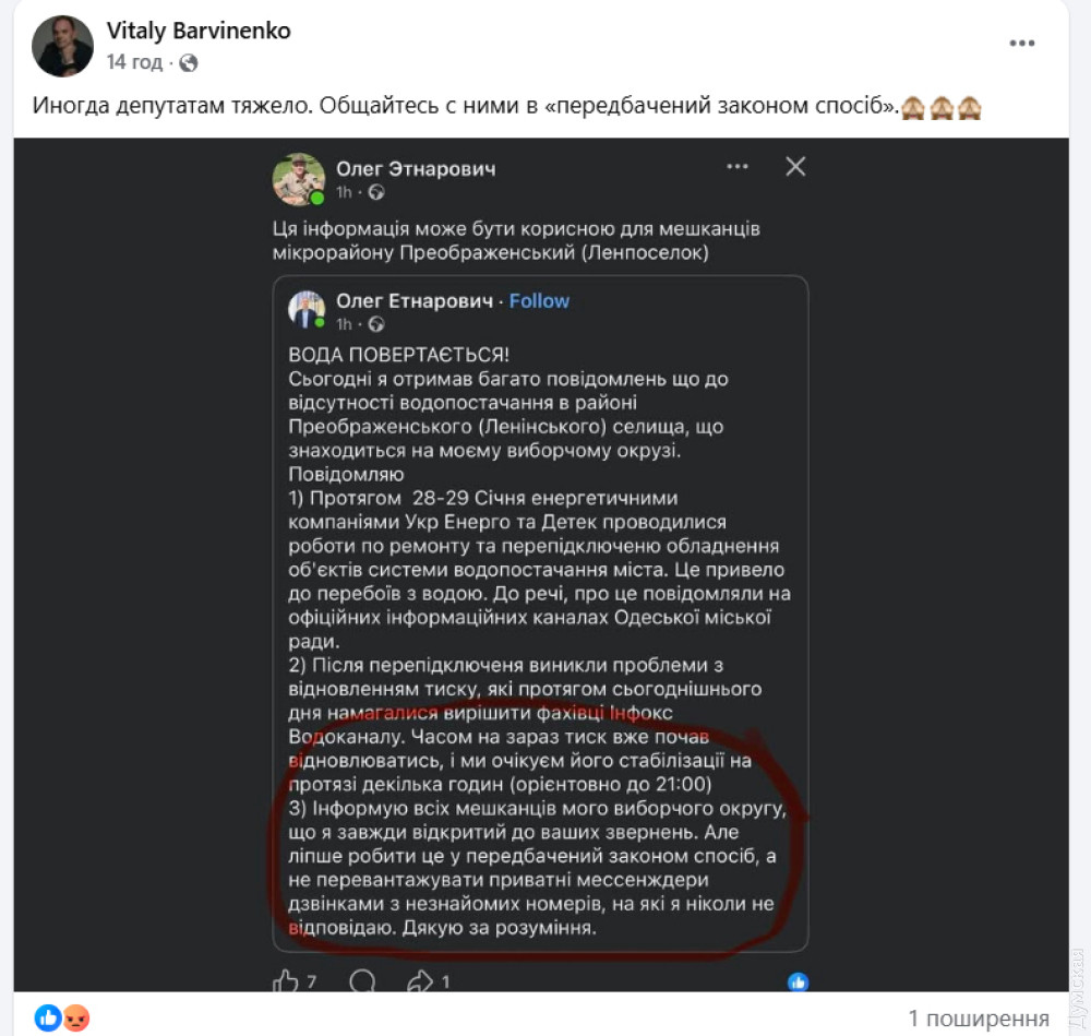 Месенджери не гумові: ексголова райради висміяв небажання депутата спілкуватися з одеситамиЧерез скарги мешканців Ленселища на відсутність води колишній голова Одеської райради Віталій Барвіненко різко розкритикував депутата міськради від «Довіряй ділам» Олега Етнаровича. За даними джерел «Думської», за цим стоїть недавня образа: ексголова району не пробачив колезі підтримку кандидатури Олександра Ахмерова на пост лідера фракції. Новим приводом стало небажання депутата відповідати на повідомлення мешканців свого округу в особистому листуванні. Мешканці, які залишилися без водопостачання, намагалися отримати інформацію, але натрапили на роздратування: Енарович поскаржився, що «втомився» від нескінченних повідомлень у месенджерах. У відповідь ексголова райради опублікував пост, сповнений сарказму. «Дорогі мешканці мікрорайону Преображенський (Ленселище)! Годину тому депутат Олег Етнарович повідомив, що у ваші будинки повернулася вода. Прошу вас припинити писати і дзвонити з незнайомих номерів в месенджери депутату Олегу Етнаровичу. Він уже повідомив, що не буде відповідати на такі звернення. Ви можете оформити офіційне депутатське звернення, яке депутат Етнарович розгляне у встановлений законом термін протягом тридцяти днів. За цей час вода або з'явиться, або вона вам вже не знадобиться. Все під Богом ходимо! Будь ласка, не перевантажуйте месенджери депутата! Вас багато, а вони не гумові!!», написав Барвіненко.