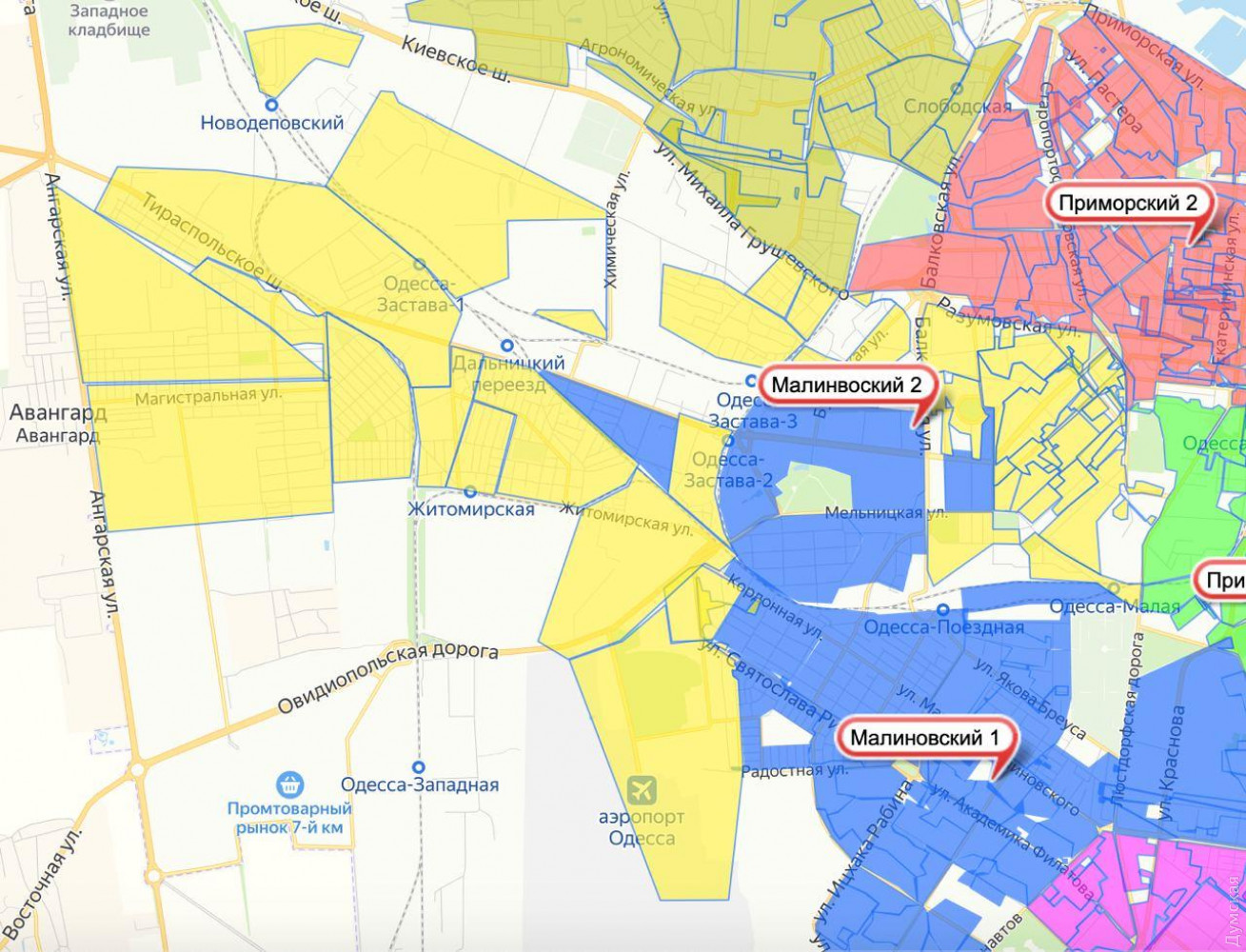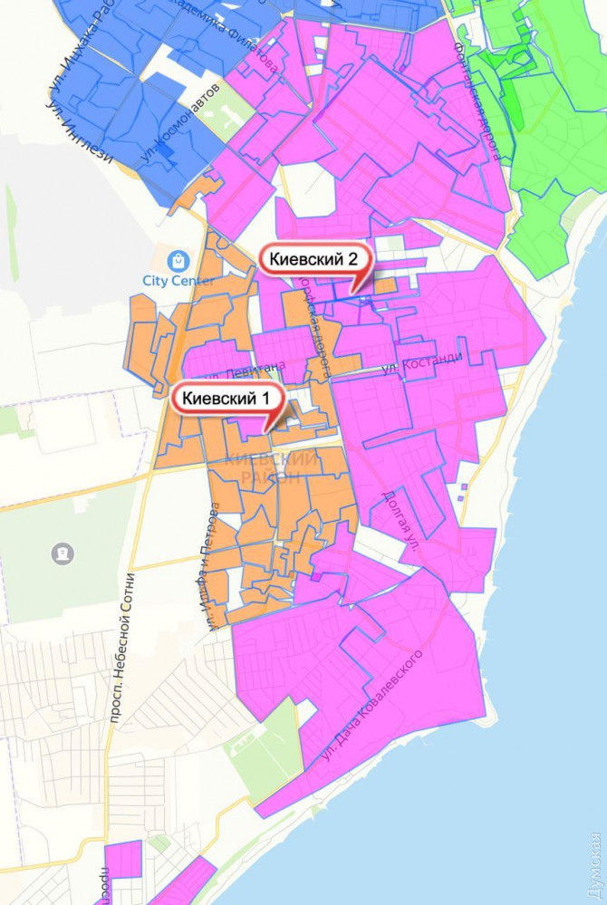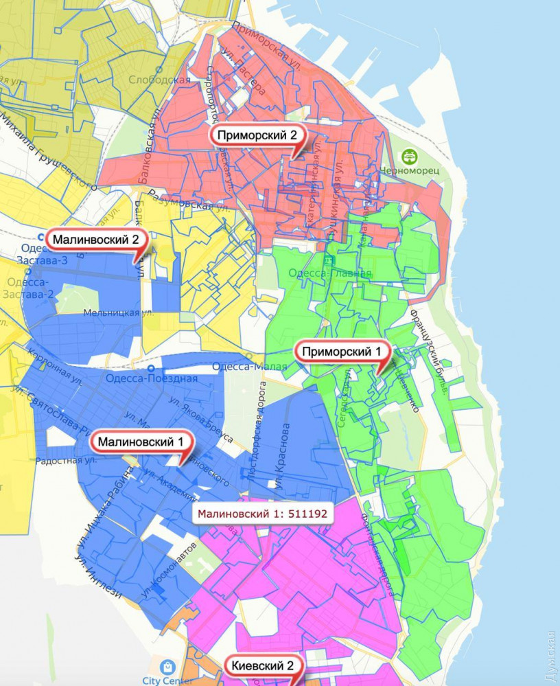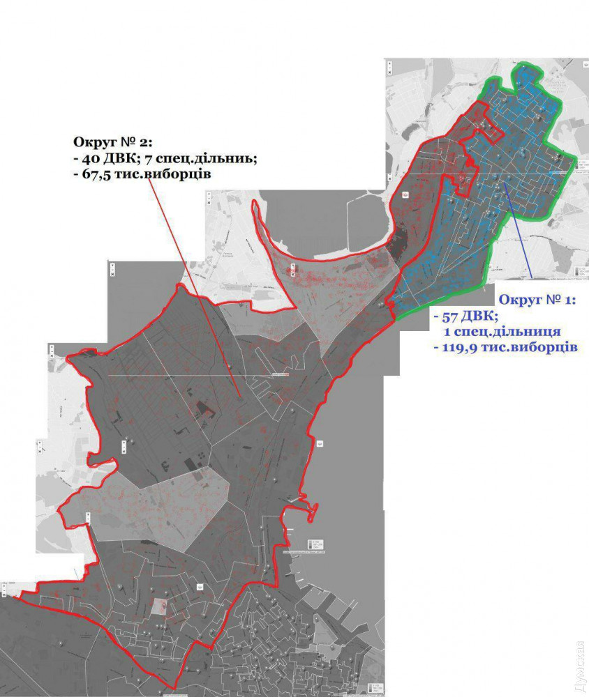 Каждый район города разделили на два округа. Причем избиратели распределились далеко не равномерно. Например, в Суворовском районе один округ растянулся по Пересыпи и Слободке и собрал 67,5 тысяч избирателей, а другой сконцентрирован в густо застроенных высотками кварталах поселка Котовского и охватил почти 120 тысяч избирателей.