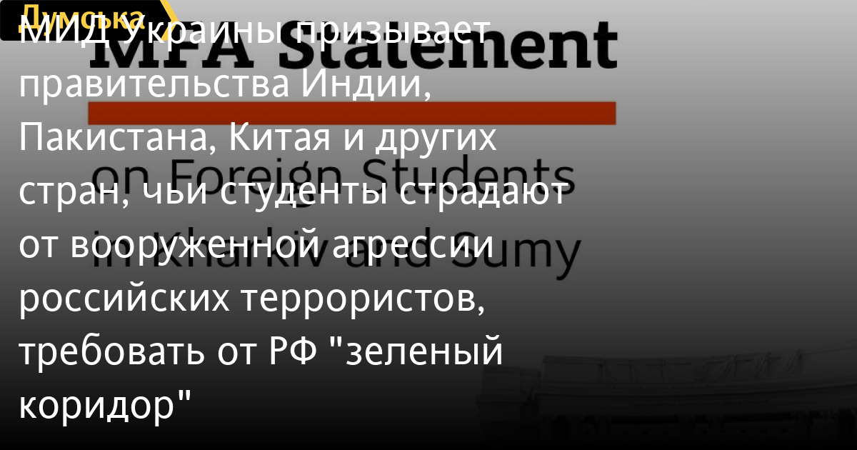 МИД Украины призывает правительства Индии, Пакистана, Китая и других стран, чьи студенты страдают от вооруженной агрессии российских террористов, требовать от РФ «зеленый коридор»МИД Украины призывает Российскую Федерацию немедленно прекратить боевые действия в Харькове и Сумах, чтобы организовать эвакуацию гражданского населения, включая иностранных студентов. Как сообщает пресс-служба министерства, сейчас в пылающей Украине есть студенты из Индии, Пакистана, Китая и других стран. Они не могут покинуть границы страны, на которую вероломно напал агрессор, из-за вражеских обстрелов и ракетных ударов по жилым районам и гражданской инфраструктуре. «Попытка организовать эвакуацию через города, подвергающиеся российским бомбардировкам и ракетным ударам, крайне опасна. Срочно призываем правительства Индии, Пакистана, Китая и других стран, чьи студенты стали заложниками вооруженной агрессии России в Харькове и Сумах, потребовать от Москвы, чтобы она разрешила открыть гуманитарный коридор через украинские города», — говорится в сообщении. В свою череды, правительство Украины обязуется оказывать иностранным студентам всю необходимую помощь, чтобы они могли безопасно вернуться на родину. СМЕРТЬ РОСІЙСЬКИМ ОКУПАНТАМ! Помітили помилку? Виділяйте слова з помилкою та натискайте control-enter |