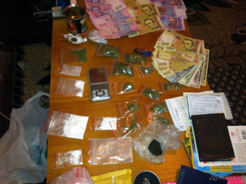 Во время обыска по месту проживания задержанного сотрудники Одесского областного управления по борьбе с незаконным оборотом наркотиков нашли 30 г амфетамина, 30 г марихуаны, 20 г гашиша и электронные весы. Также были изъяты деньги в сумме трех тысяч гривен и 360 долларов США, 2 планшета, 4 мобильных телефона для связи с потребителями наркотических средств и психотропных веществ. Изъятое направлено на экспертизу.