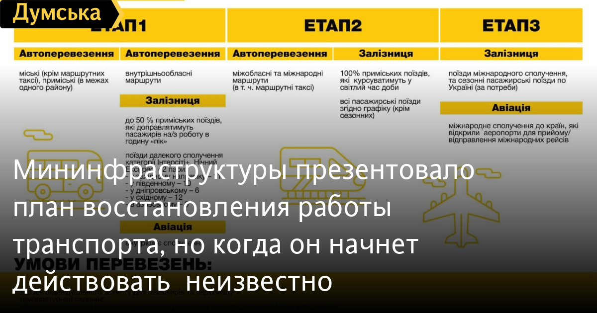 Мининфраструктуры презентовало план восстановления работы транспорта, но когда он начнет действовать – неизвестноМинистерство инфраструктуры Украины разработало план из трех этапов по восстановлению регулярного пассажирского сообщения в Украине. Об этом сообщил министр инфраструктуры Владислав Криклий. На первом этапе предполагается возобновление городских автоперевозок (кроме маршрутных такси) и пригородных (в пределах одного района), а также внутриобластных маршрутов. На железной дороге планируют запустить 50% пригородных поездов, чтобы доставлять людей с/на работу в часы «пик», а также поезда «Интерсити +» дальнего следования и ночной экспресс. Кроме того, на первом этапе предполагается возобновление внутреннего авиасообщения. Второй этап плана предполагает восстановление межобластных и международных маршрутов, в том числе разрешение на работу маршруток. Также запустят все пригородные поезда, которые будут курсировать в светлое время суток, и возобновят все пассажирские поезда по графику, кроме сезонных. На третьем этапе планируется запуск поездов международного сообщения и при необходимости — сезонных рейсов в Украину, а также возобновление международного авиасообщения в страны, которые открыли аэропорты. Правда, когда и с каким интервалом будут вводиться все эти этапы пока неизвестно. Криклий отметил, что даты этапов должны быть утверждены с МОЗ до конца текущей недели. «Работаем с авиаперевозчиками и МИД, чтобы определить страны, с которых начнется возобновление международного авиасообщения. Авиакомпании предлагают возобновлять внутренние перелеты одновременно с международными», — подчеркнул министр инфраструктуры. СМЕРТЬ РОССИЙСКИМ ОККУПАНТАМ! Заметили ошибку? Выделяйте слова с ошибкой и нажимайте control-enter |