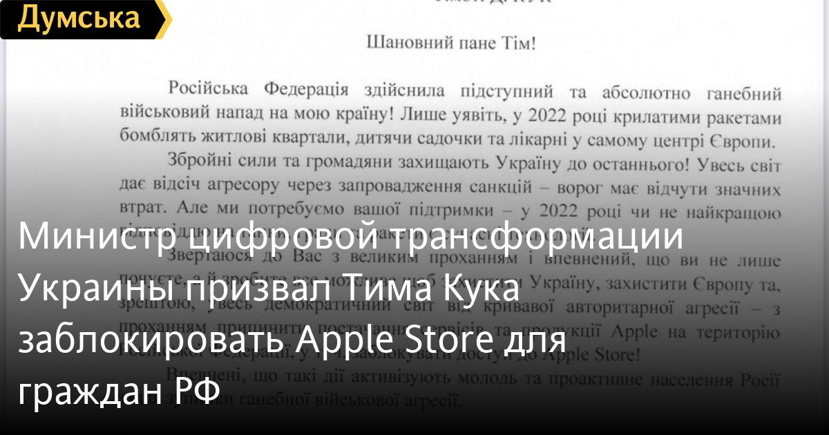 Министр цифровой трансформации Украины призвал Тима Кука заблокировать Apple Store для граждан РФМинистр цифровой трансформации Украины Михаил Федоров обратился к СЭО компании Apple Тиму Куку с просьбой заблокировать для граждан РФ Apple Store, поддержать пакет санкций правительства США и запретить загружать свои продукты в маркеты. «Разрешаете выбирать себе президентом убийцу, тогда придется наслаждаться сайтом россия 24», — написал Федоров. Также сообщается, что россиянам заблокировали Pornhub. «Российские пользователи, пытавшиеся зайти на порнохаб, были буквально заблокированы сообщением о том, что контент остановлен, а также флагом Украины и сообщением о поддержке Украины», — говорится в сообщении. СМЕРТЬ РОССИЙСКИМ ОККУПАНТАМ! Заметили ошибку? Выделяйте слова с ошибкой и нажимайте control-enter |