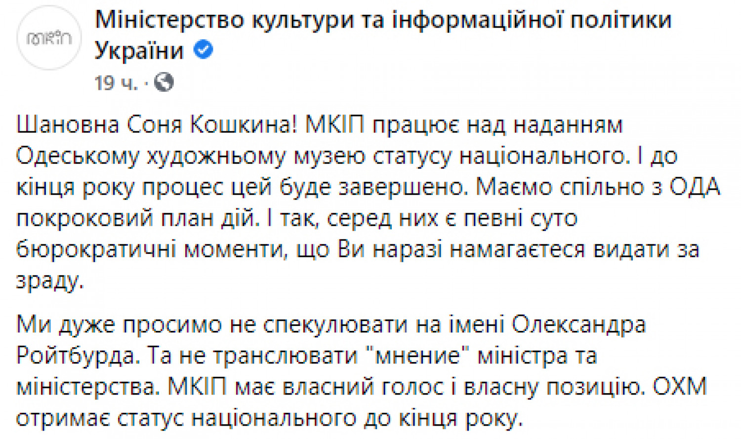 «МКИП работает над предоставлением Одесскому художественному музею статуса национального, — говорится в заявлении. — И до конца года процесс этот будет завершен. Имеем совместно с ОГА пошаговый план действий. И да, среди них есть определенные сугубо бюрократические моменты, которые вы сейчас пытаетесь выдать за зраду», — обратилось ведомство к главному редактору издания «Левый берег» Соне Кошкиной.