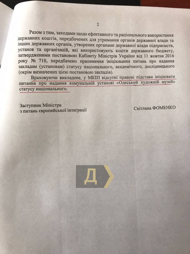 Последняя довольно эмоционально прокомментировала официальный ответ замминистра культуры Светланы Фоменко на обращение главы Одесской облгосадминистрации Сергея Гриневецкого. Чиновница отмечает в нем, что у министерства отсутствуют правовые основания инициировать вопрос о предоставлении статуса национального Одесскому худмузею.