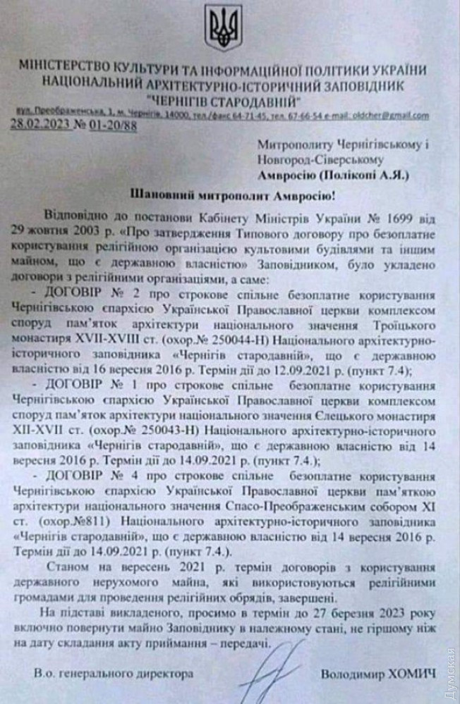 Митрополиту Чернігівському і Новгород-Сіверському Амвросію (Андрію Полікопі) з Мінкульту надійшов лист із вимогою до 27 березня покинути комплекс історичних релігійних споруд.