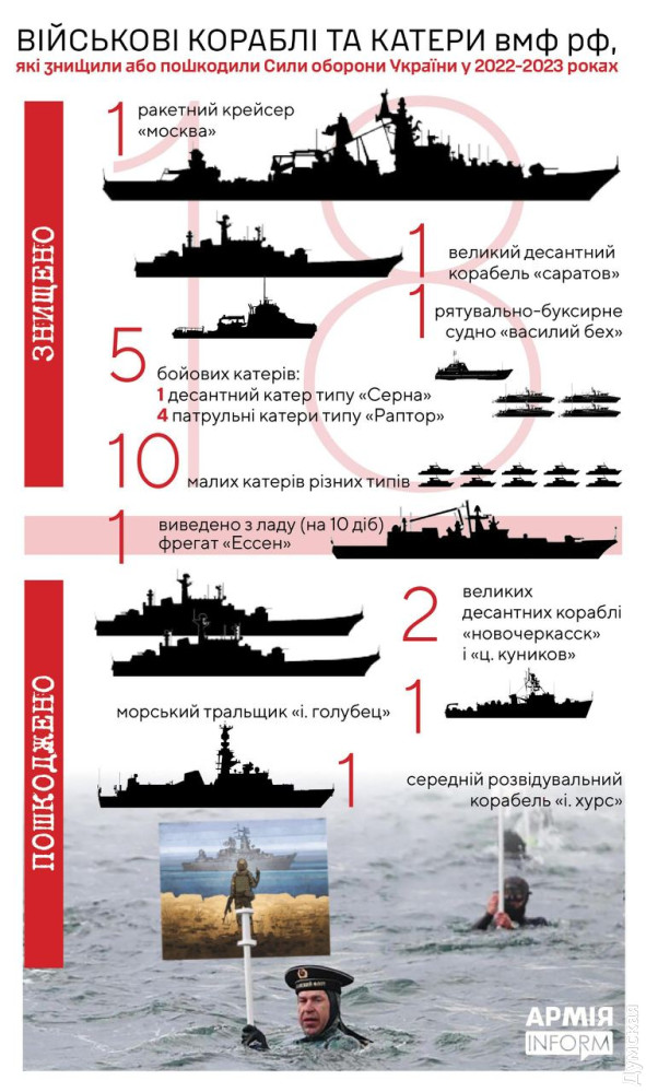 Міноборони України підтвердило пошкодження російського фрегатаФрегат чорноморського флоту росії «Адмірал Ессен» зазнав пошкоджень і був виведений з ладу на десять днів. Про це повідомили в Міністерстві оборони України. Нагадаємо, фрегат був пошкоджений під час операції зі звільнення острова Зміїний у червні 2022 року. Тоді в Генштабі Збройних сил України заявили, що ворожий корабель був уражений безпілотником «Байрактар». За іншою інформацією, фрегат був вражений протикорабельною ракетою. Також у Міністерстві оборони підтвердили нещодавнє пошкодження середнього розвідувального корабля ворога «Іван Хурс». Від початку повномасштабного вторгнення окупанти втратили 18 кораблів і катерів, було пошкоджено ще п'ять бортів. СМЕРТЬ РОСІЙСЬКИМ ОКУПАНТАМ! Помітили помилку? Виділяйте слова з помилкою та натискайте control-enter |