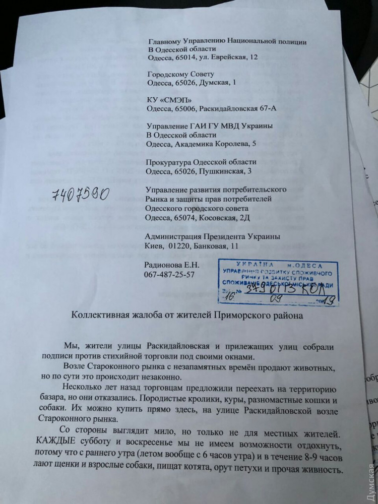 В этом плане, нарушается Конституционное право на отдых жителей ул. Раскидайловской на этом жилом квартале со стороны продавцов животных. А еще по выходным дням затруднен проезд по ул. Раскидайловской от ул. Косвенной до ул. Ризовской (Севастопольской) из-за того, что хозяева торгуют своими животными с тротуара, зачастую из багажника своего автомобиля, стоящего на тротуаре. А покупатели ходят по проезжей части.